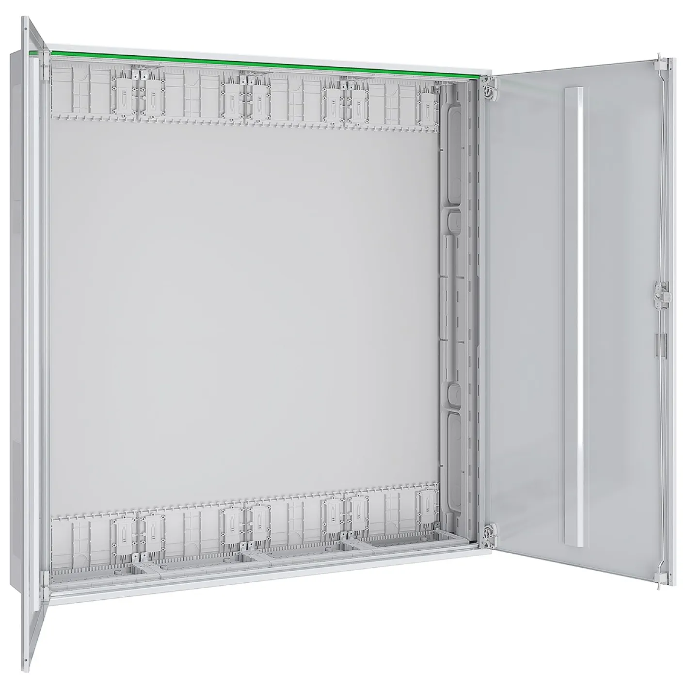 Dank Schutzklasse II, Schutzart IP44 und hoher Schlagfestigkeit (IK10) schützt das Gehäuse zuverlässig vor Staub, Spritzwasser und mechanischen Einwirkungen. Die 7 Reihen mit insgesamt 336 Teilungseinheiten (TE) ermöglichen den Einbau umfangreicher Schalt-, Steuer- oder Sicherungskomponenten. Die elegante, weiße Oberfläche (RAL 9016) sorgt für eine dezente Optik, die sich harmonisch in jede moderne Elektroinstallation einfügt.