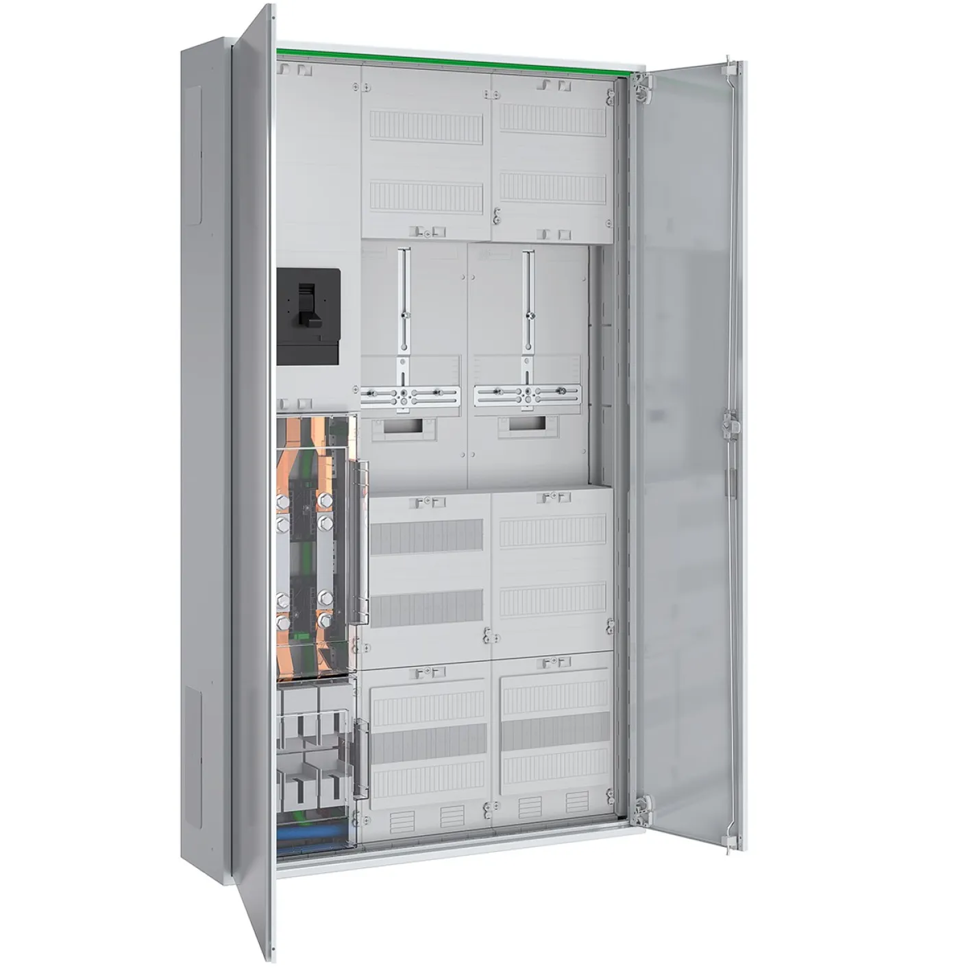 Dank des durchdachten Aufbaus und der 5-poligen Sammelschiene haben Sie maximale Flexibilität im Anschluss, insbesondere bei komplexen Energieverteilungen wie Mehrfamilienhäusern, Gewerbeobjekten oder Produktionsstätten. Die hochwertige Stahlkonstruktion garantiert lange Haltbarkeit und sicheren Betrieb, auch bei erhöhten Anforderungen.