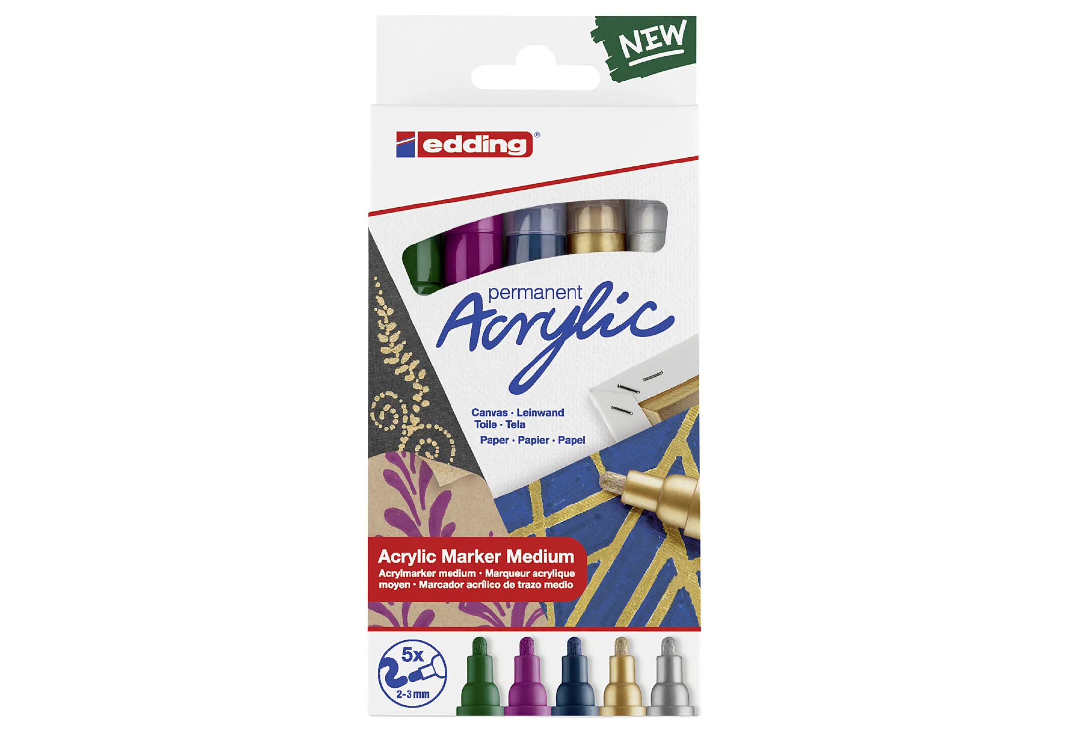 edding Acrylmarker Set 5100, Acrylstifte 2-3 mm Rundspitze, 5 Farben moosgrün beere nachtblau gold silber