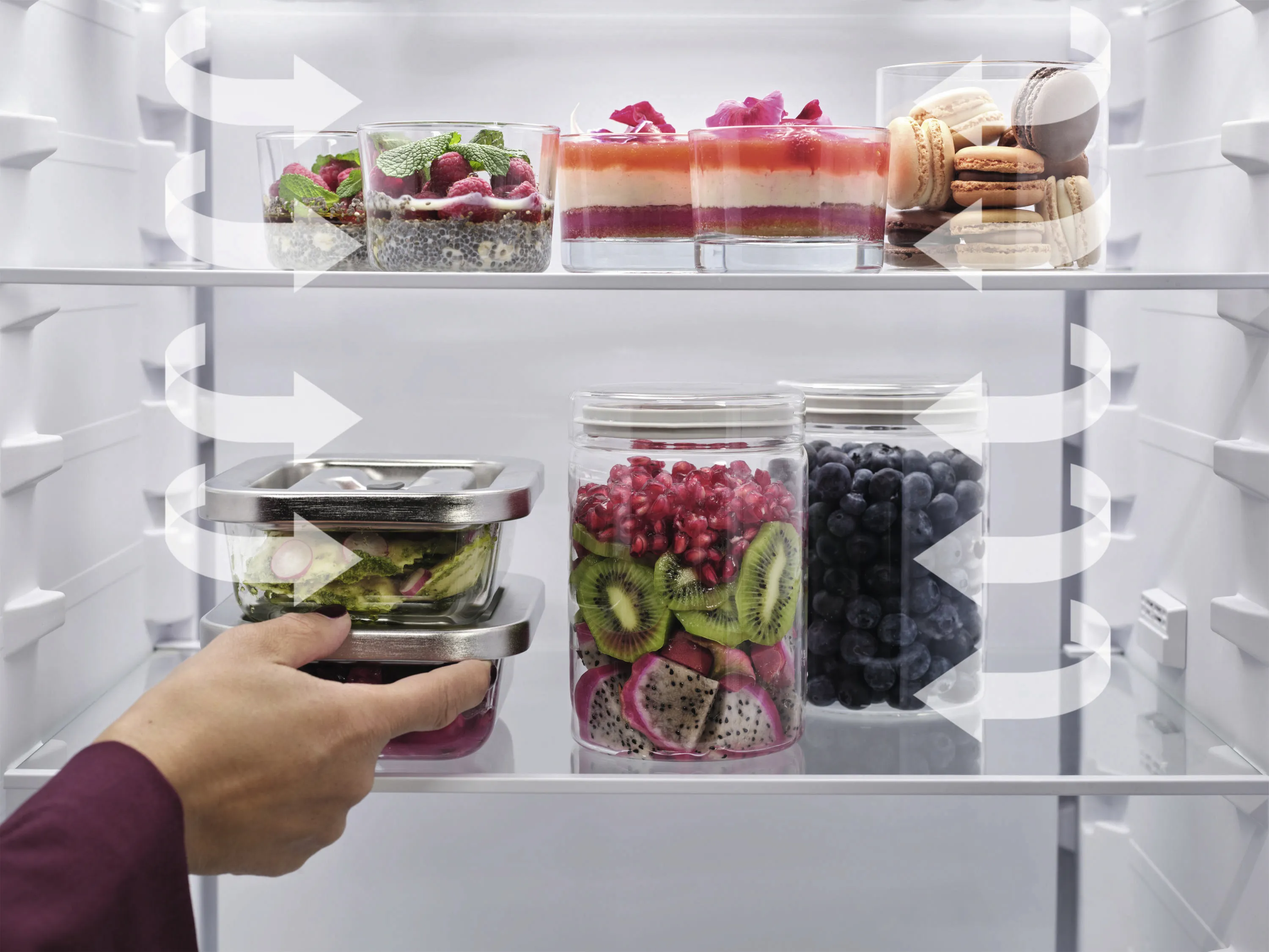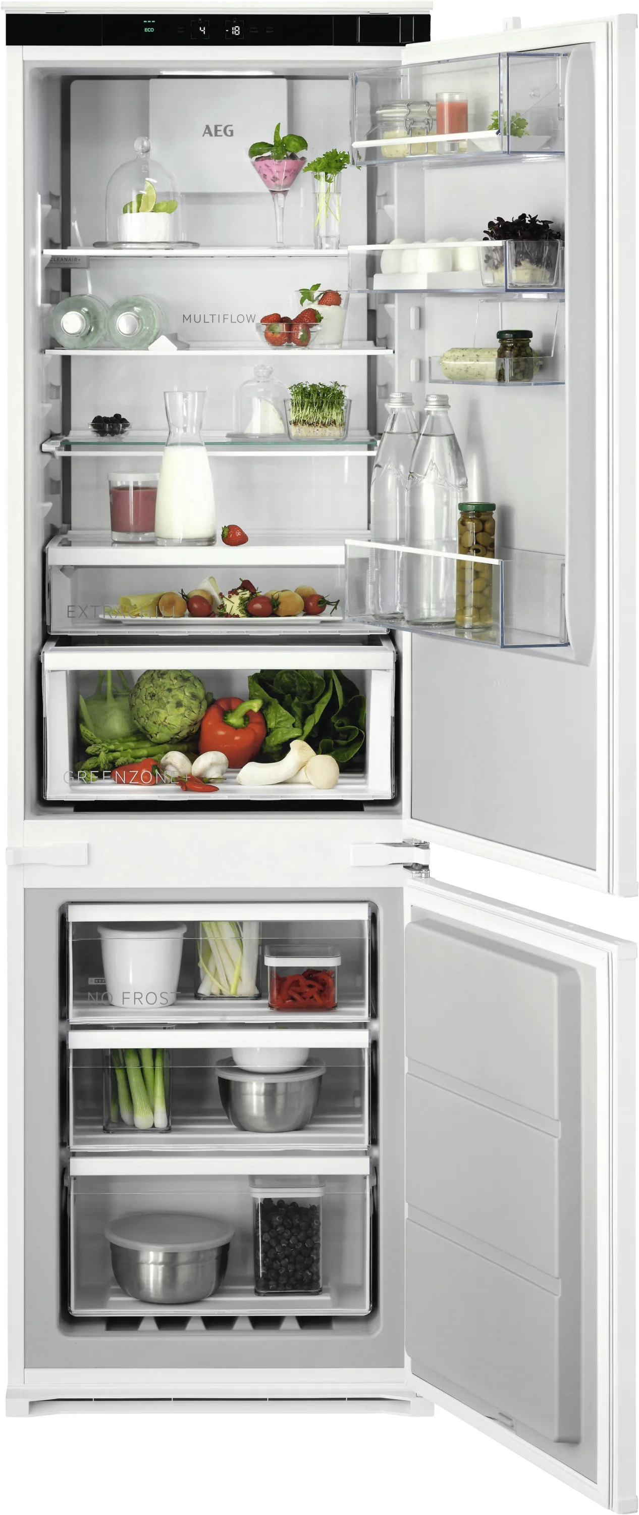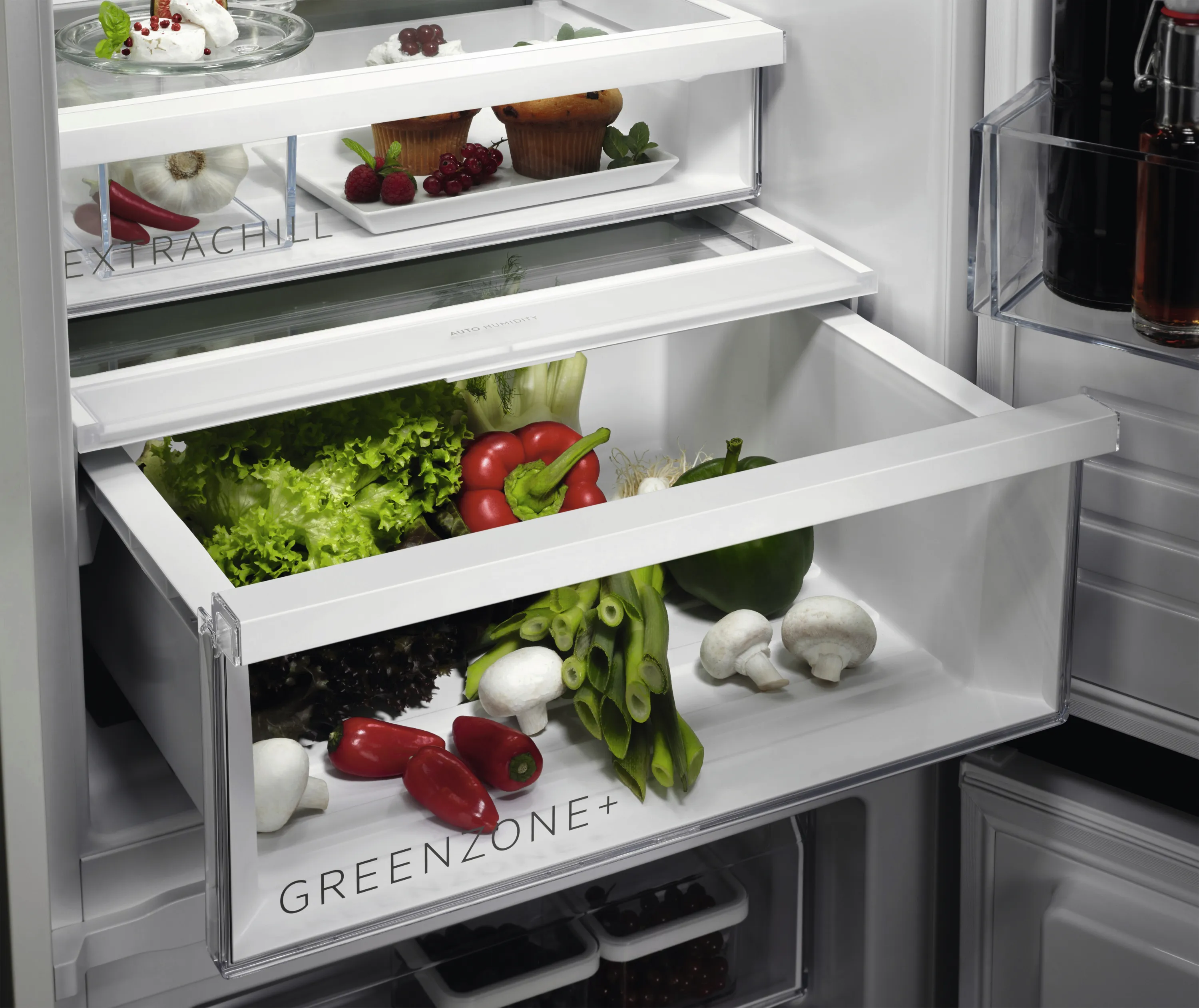GreenZone+ Frischeschublade sorgt mit optimaler Feuchtigkeitskontrolle dafür, dass Obst und Gemüse länger frisch bleiben – bis zu 95 % Vitaminerhalt, bestätigt durch unabhängige Tests. Die TwinTech® NoFrost Technologie verhindert Eisbildung im Gefrierteil und hält Lebensmittel durch getrennte Kühlkreisläufe länger frisch. Das MultiFlow-System garantiert eine gleichmäßige Temperaturverteilung, während die ExtraChill Schublade empfindliche Lebensmittel wie Fisch, Fleisch und Käse optimal lagert.