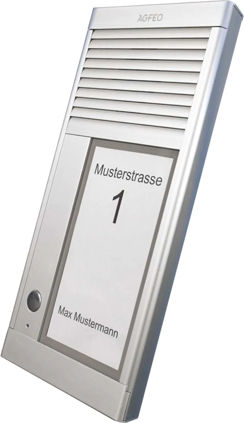 Die AGFEO DoorSpeak 1 richtet sich an alle, die Wert auf Sicherheit, einfache Bedienung und ein modernes Erscheinungsbild legen – vom Einfamilienhaus bis hin zum kleinen Unternehmen. Das große, beleuchtete Infoschild sorgt auch in der Dämmerung für eine perfekte Sichtbarkeit Ihres Namens oder Ihrer Firmenbezeichnung. Vertrauen Sie bei der Zutrittskontrolle auf Technik „Made in Germany“ und genießen Sie das Gefühl von Sicherheit und Komfort – Tag für Tag.