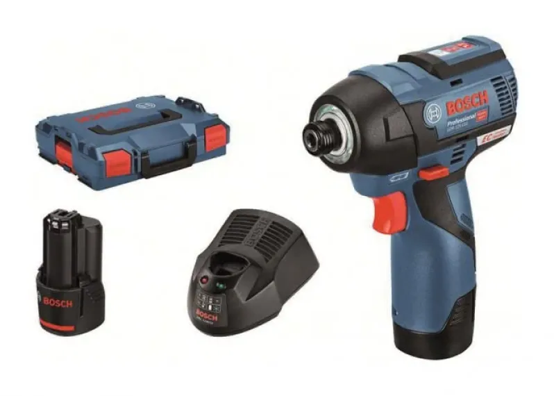 Akku-Drehschlagschrauber GDR 12V-110 Professional. Mehr Lebensdauer und höhere Präzision und dabei so kompakt wie immer. 100 Prozent längere Lebensdauer durch die bürstenlose EC-Motorentechnologie und einem optimierten Schlagwerk. Höhere Genauigkeit beim Schrauben: 2-stufige PowerControl um Überdrehen von kleinen Schrauben zu vermeiden und ein maximaler Drehmoment von 110 Nm. Höhere Laufzeit durch die 2,5 Ah Akkupacks. LED-Ringlicht zur Beleuchtung des Arbeitsbereichs auch an dunklen Stellen. HEX9 Multi Construction Bohrer - Bohren mit dem Akku-Schlagschrauber. Deutlich längere Laufleistung durch höchste Effizienz und die Bosch-Akkutechnologie. Sehr kompakte Bauform für perfekte Handhabung auch an engsten Stellen und Überkopf-Arbeiten. Bürstenlose EC-Motor-Technologie von Bosch für bis zu 100 Prozent längere Lebensdauer. L-BOXX-Einlage für Zubehör, L-BOXX-Einlage für Gerät, L-BOXX 102 (1 600 A00 1RP), Schnellladegerät GAL 1230 CV (1 600 A00 R44), 2 x Akku GBA 12V 3.0 Ah (1 600 A00 X79).