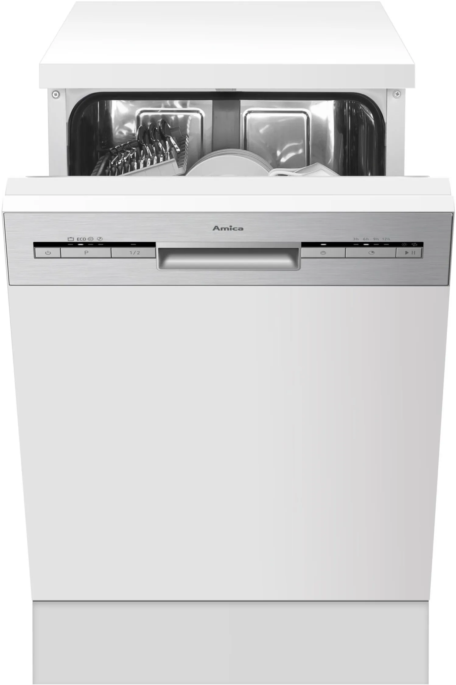 Der Amica EGSP 569 900 E Einbau-Geschirrspüler überzeugt mit kompaktem Design, moderner Edelstahlfront und flexibler Ausstattung – ideal für kleine Küchen, Paare oder kleine Familien. Mit nur 45 cm Breite passt das teilintegrierte Modell auch in schmale Nischen und sorgt für glänzend sauberes Geschirr bei jedem Spülgang.