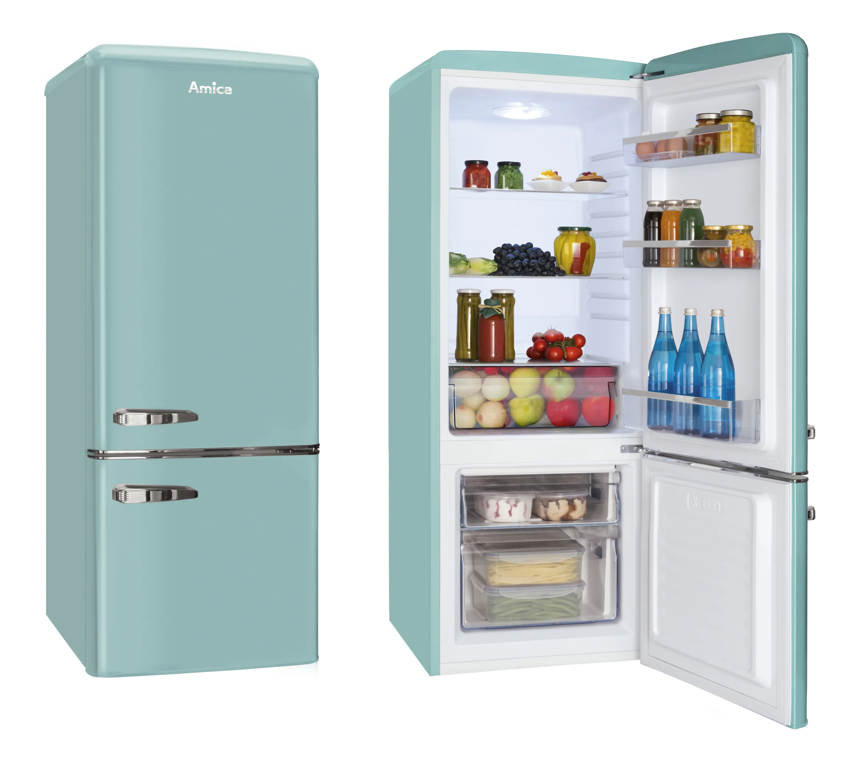 Die Amica KGCR 384 150 T Kühl-Gefrierkombination verbindet modernes Kühlen mit angesagtem Retro-Design. Das stilvolle Gehäuse in Ice Blue mit verchromtem Metallgriff bringt den Charme der 50er Jahre in Ihre Küche und überzeugt durch durchdachte Technik sowie hohen Bedienkomfort. Ideal für alle, die Retro-Optik und zeitgemäße Energieeffizienz schätzen!