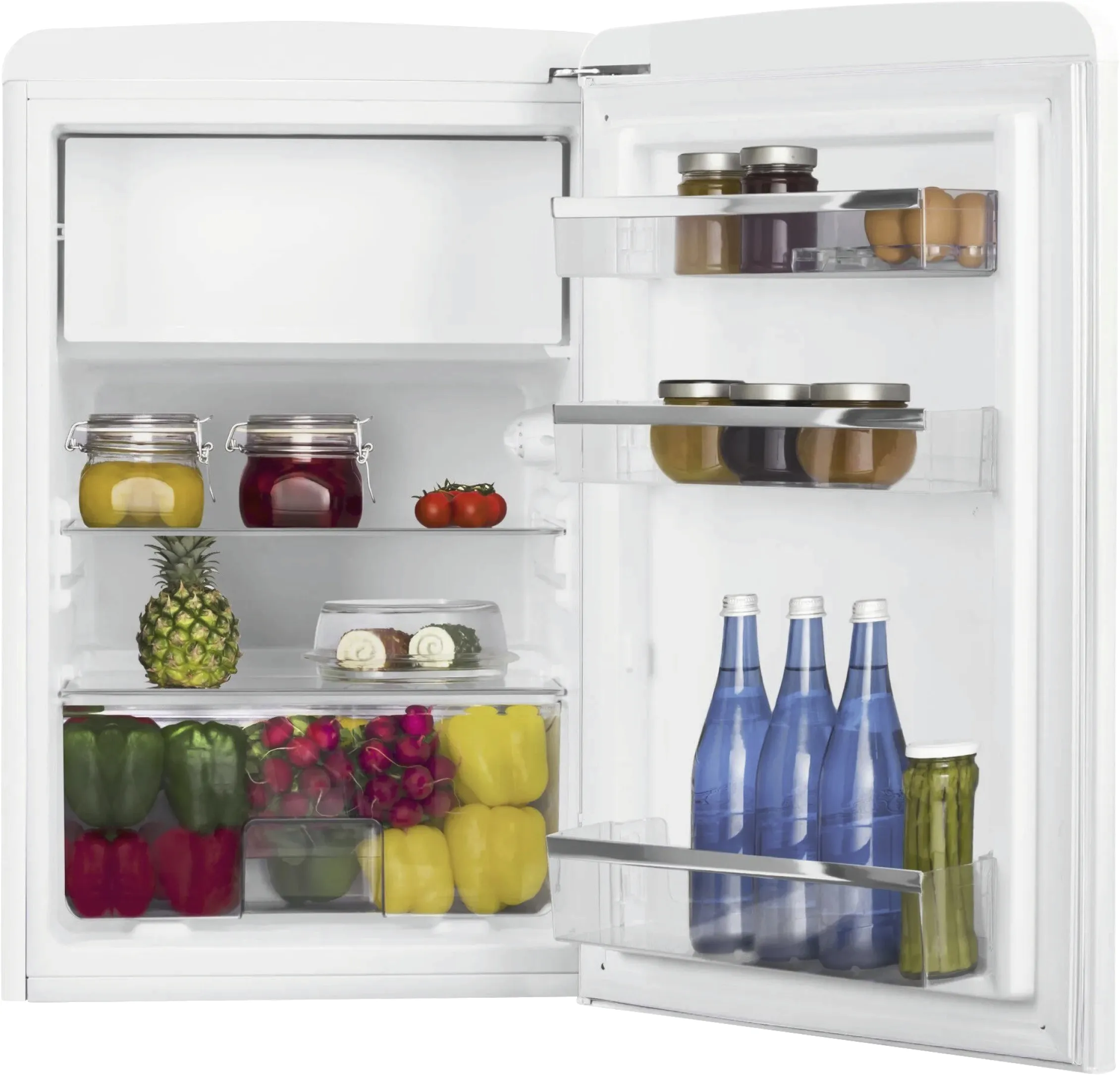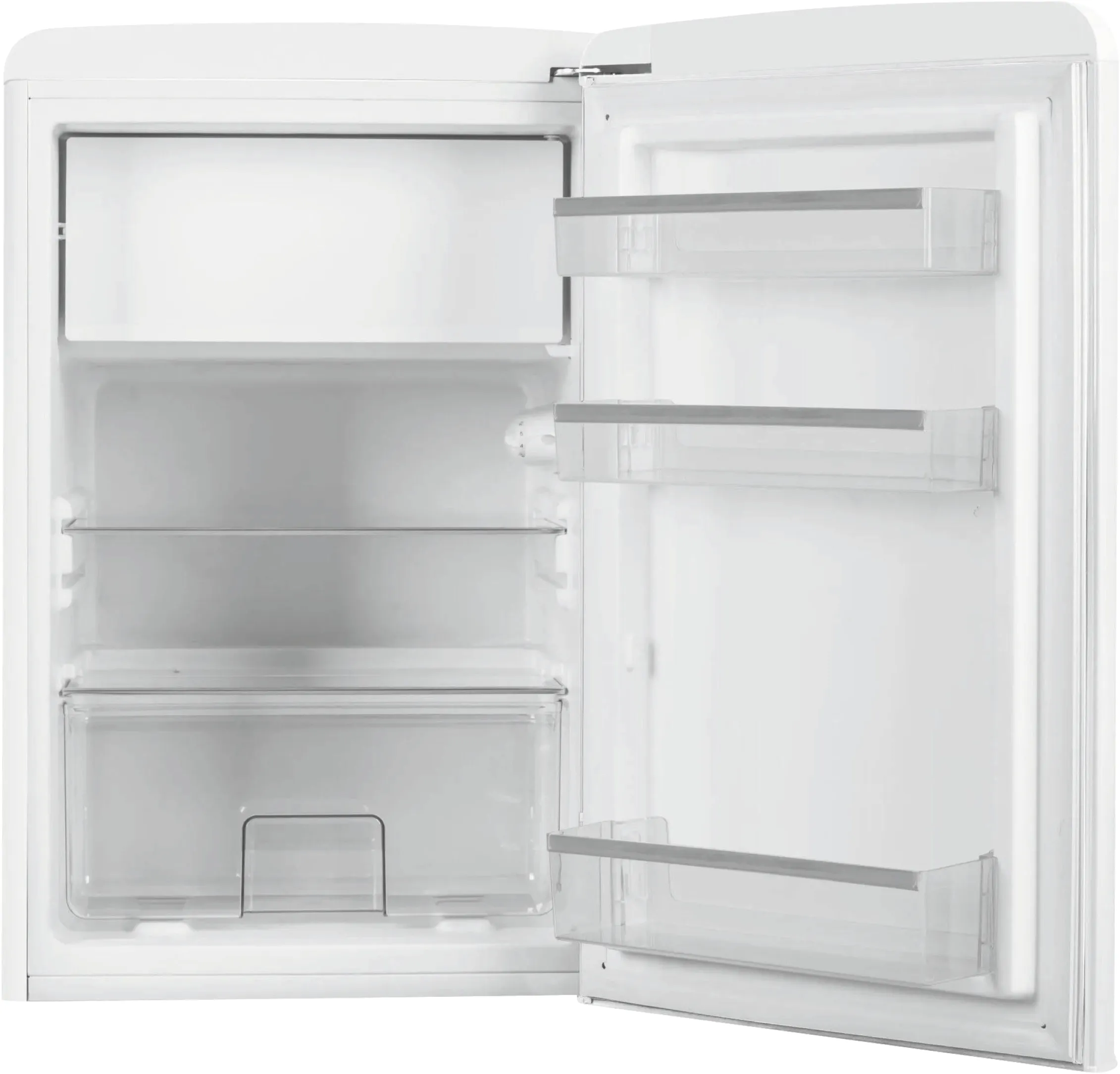Der Amica KSR 361 160 W Retro Kühlschrank im Farbton Snow White kombiniert klassisches Retro-Design mit moderner Kühltechnik. Mit seinem kompakten Format und dem integrierten Gefrierfach eignet sich das Standgerät ideal für kleine Haushalte, Büros oder als Zweitkühlschrank. Die klaren Linien und das zeitlose Weiß machen ihn zu einem stilvollen Blickfang in jeder Küche.