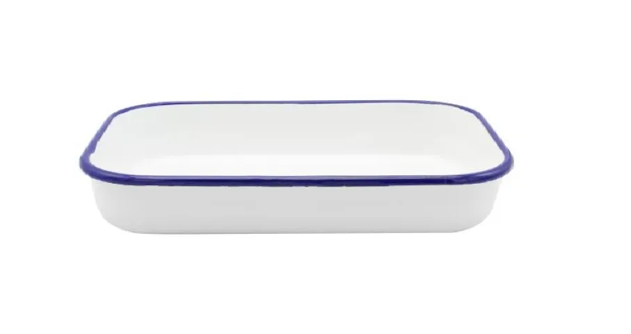 Profitieren Sie von einer praktischen, schnitt- und kratzfesten Backform, die dank ihres robusten Stahlemaille-Materials auch bei intensiver Nutzung lange Freude bereitet. Das klassische weiße Design mit elegantem blauem Rand macht die Form nicht nur zum funktionalen Küchenutensil, sondern auch zum Blickfang auf jeder Tafel.