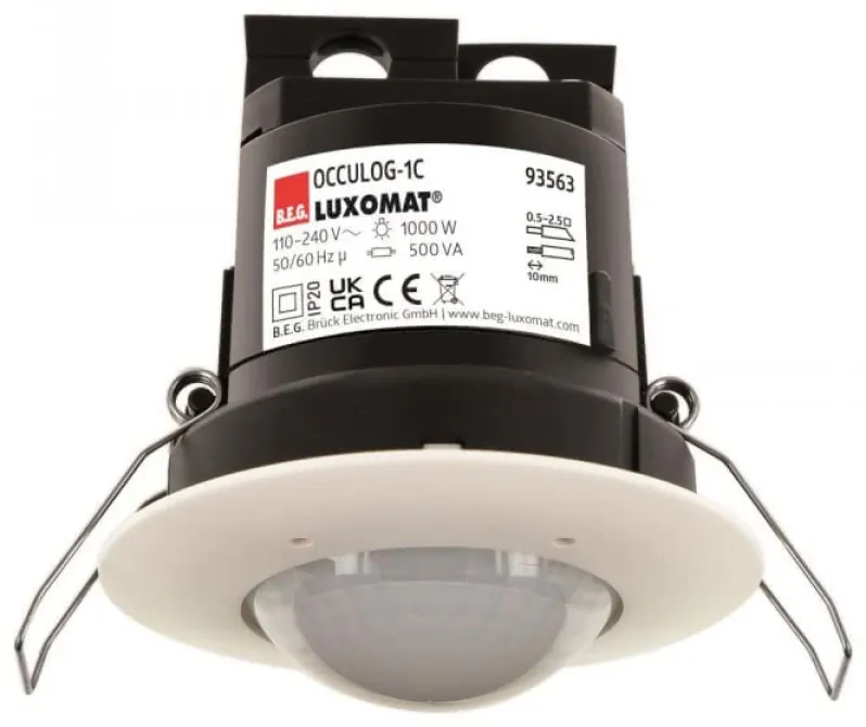 Der VOC-Indikator von B.E.G. ist ein moderner Raumluftsensor für Deckenmontage, der flüchtige organische Verbindungen (VOC) erkennt. Die farbige LED-Ampel zeigt die Luftqualität auf einen Blick: Grün steht für gute Luft, Gelb empfiehlt das Lüften, Rot signalisiert Handlungsbedarf.