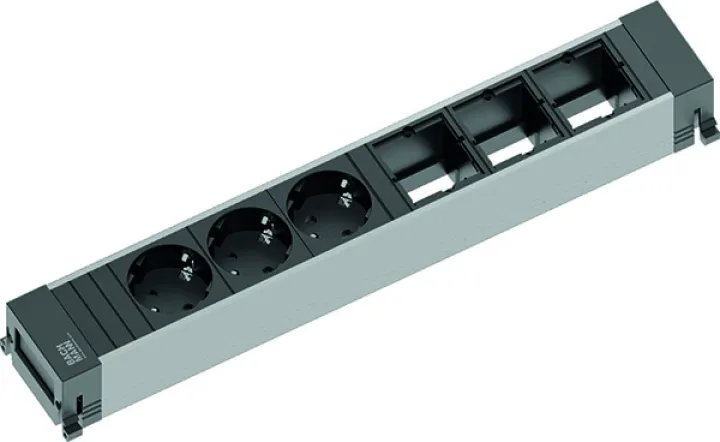 Die Power Frame bietet eine durchdachte Ausstattung: 3 Schutzkontakt-Steckdosen mit integriertem Kinderschutz sorgen für Sicherheit, während 3 Leerfelder Ihnen die Möglichkeit geben, Ihre Steckdoseneinheit individuell zu erweitern – beispielsweise mit Netzwerk-, USB- oder HDMI-Modulen. Das eloxierte Aluminiumgehäuse überzeugt mit moderner Optik und langanhaltender Stabilität für den professionellen Dauereinsatz.