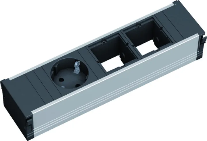 Die BACHMANN CONI Steckdoseneinheit 912.002 ist Ihre clevere Lösung für flexible und moderne Stromversorgung am Arbeitsplatz, im Homeoffice oder im Konferenzraum. Mit ihrem stabilen, eloxierten Aluminiumgehäuse in edlem Schwarz/Silber fügt sich diese Steckdoseneinheit stilvoll und unaufdringlich in jede Umgebung ein. Die Kombination aus einer gedrehten SCHUKO-Steckdose und zwei modularen Leerplätzen ermöglicht die individuelle Anpassung an verschiedenste Anforderungen – von Strom über Daten- bis hin zu Netzwerk- oder Multimediaanschlüssen.