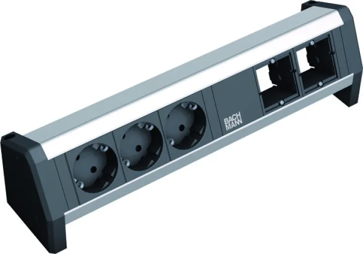 Die BACHMANN 902.001 Steckdosenleiste DESK 3xSchuko 2xABD GST18 vereint höchste Verarbeitungsqualität mit funktionalem Design. Mit drei Schutzkontaktsteckdosen und zwei individuell konfigurierbaren Abdeckfeldern bietet diese Steckdoseneinheit eine zuverlässige Stromversorgung für moderne Arbeitsplätze, Home-Offices und professionelle Anwendungsbereiche. Das robuste Gehäuse aus eloxiertem Aluminium in Kombination mit bruchsicherem, schwarz gehaltenem Polyamid sorgt für langlebige Stabilität und einen eleganten Look – perfekt für den produktiven Alltag.