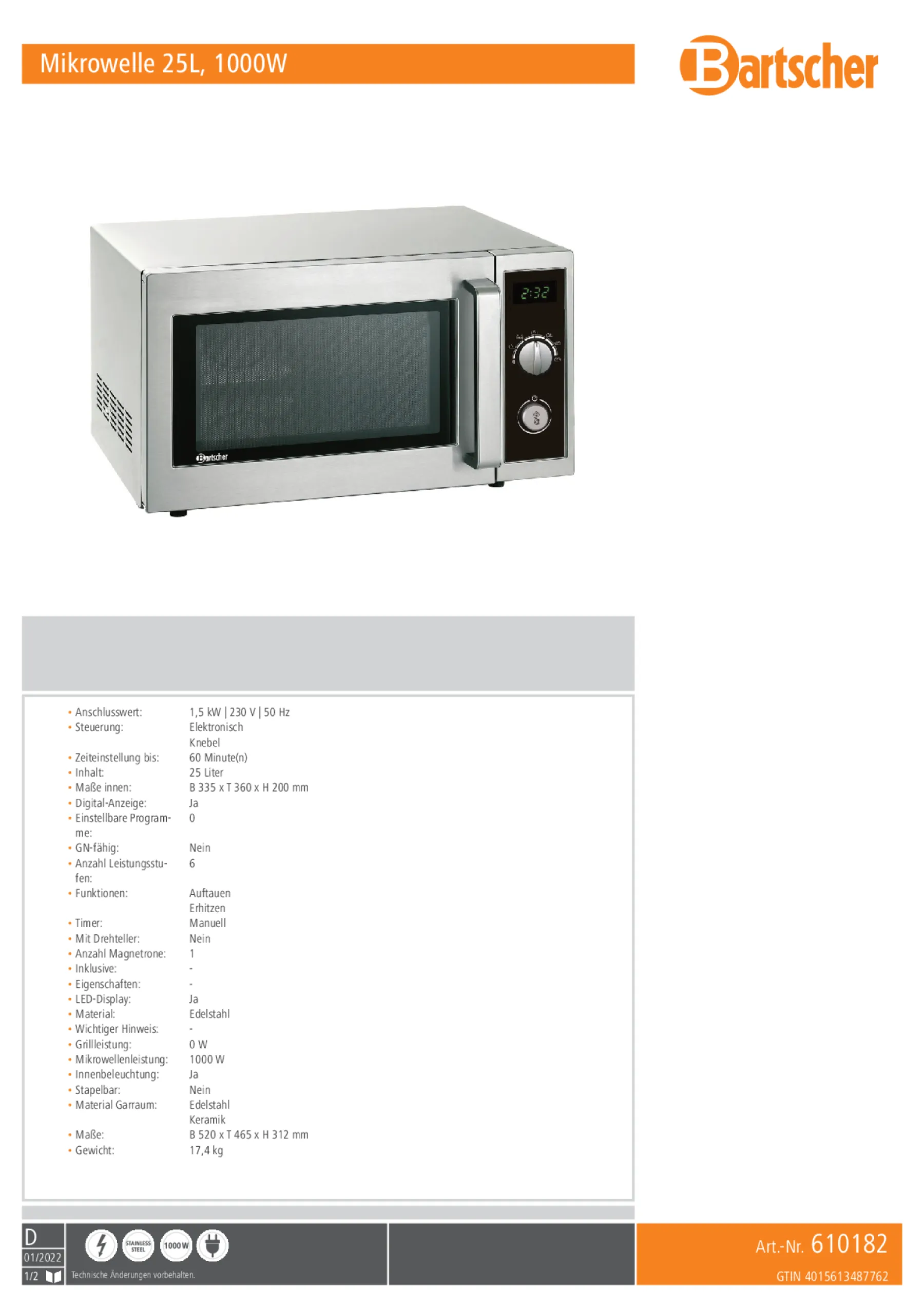 Optimieren Sie Ihre Küchenorganisation mit der Bartscher Mikrowelle 25L, 1000W – für schnelles, komfortables und sicheres Erhitzen sowie Auftauen. Setzen Sie auf Qualität, Technik und modernes Design!