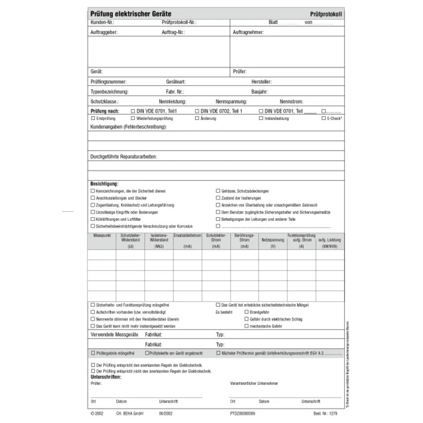 Beha-Amprobe Prüfprotokollblock 3313435, DIN VDE 0701-0702, 50 Blatt mit Durchschlag