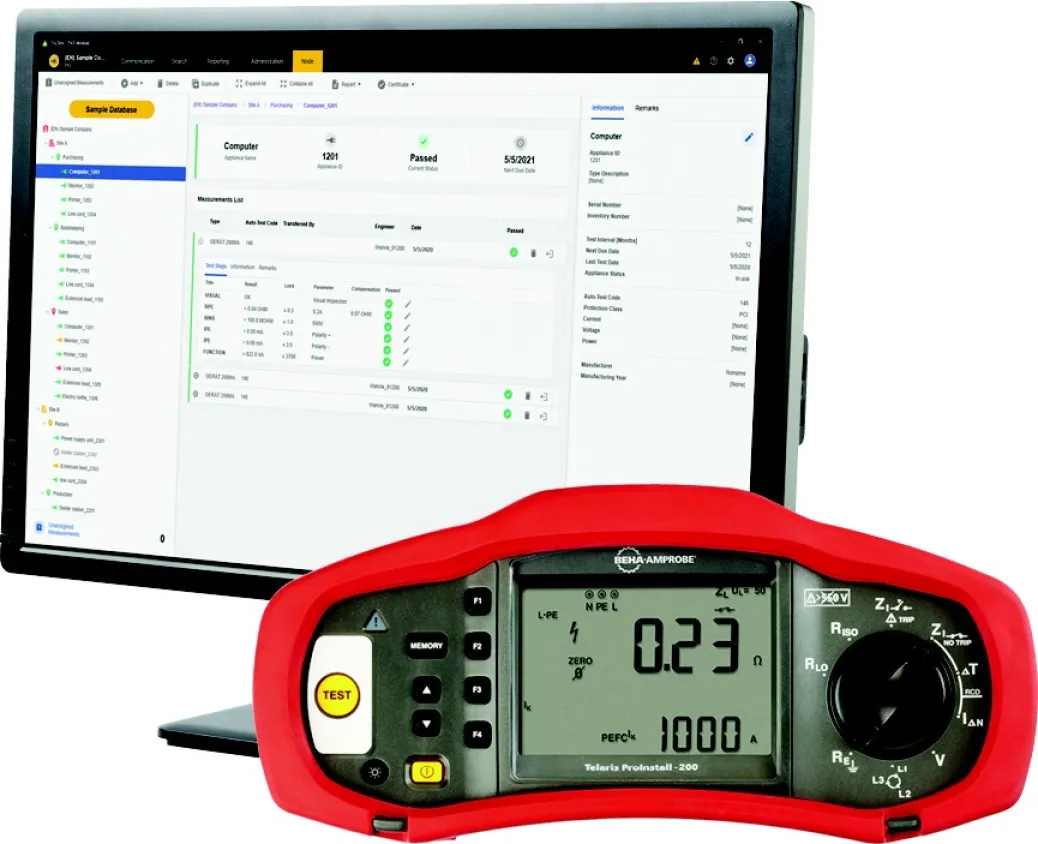 Kombiniertes Installationsmessgerät Beha-Amprobe PROINSTALL-200-D, für Prüfungen nach DIN VDE 0100, gebündelt mit Datenmanagement- und Berichterstellungssoftware Fluke TruTest . Fluke TruTest Software wurde entwickelt, um den Aufwand zur Datenverwaltung und Berichterstellung gegenüber dem herkömmlichen Datenmanagement für elektrische Systeme deutlich zu verringern. Unabhängig davon, ob Sie Geräte in einem Büro prüfen, Reparaturen in einer Werkstatt verifizieren oder jährliche Sichtprüfungen durchführen, ist ein angemessenes Datenmanagement für die Erstellung leicht verständlicher Berichte für Kunden von entscheidender Bedeutung. Die TruTest-Software ermöglicht den schnellen und einfachen Import von Messergebnissen direkt von Messgeräten, Dateien verwalten oder bei Bedarf manuell eingeben.