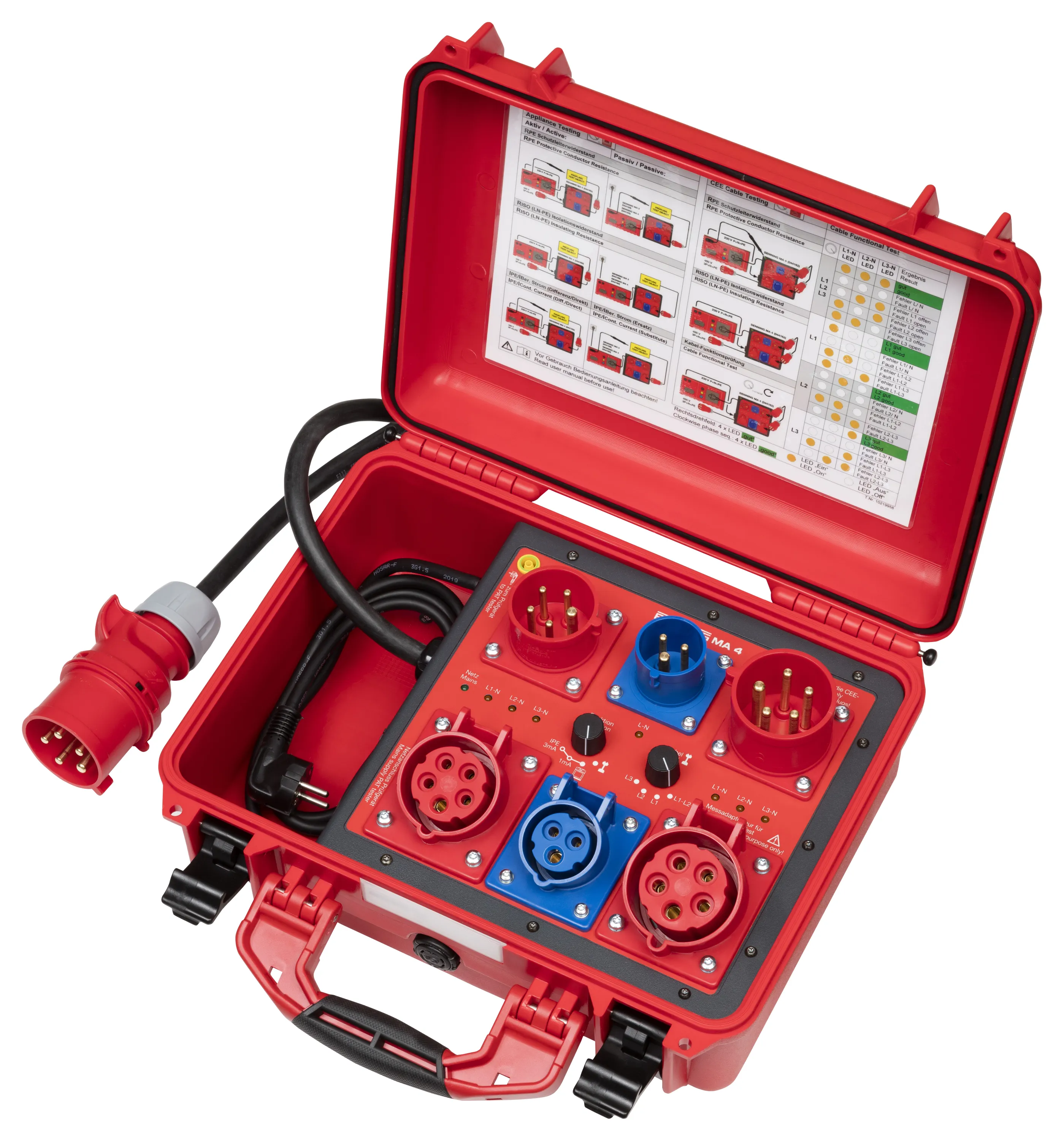 Dank passgenauer CEE-Anschlüsse (16A/32A, 230V/400V) und einer maximalen Strombelastbarkeit von bis zu 32A sind Sie für jede Herausforderung bestens gerüstet. Die gezielte Zuschaltung eines Fehlerstroms ermöglicht einen zuverlässigen Systemtest in Sekundenschnelle – für mehr Effizienz und Sicherheit im Arbeitsalltag.