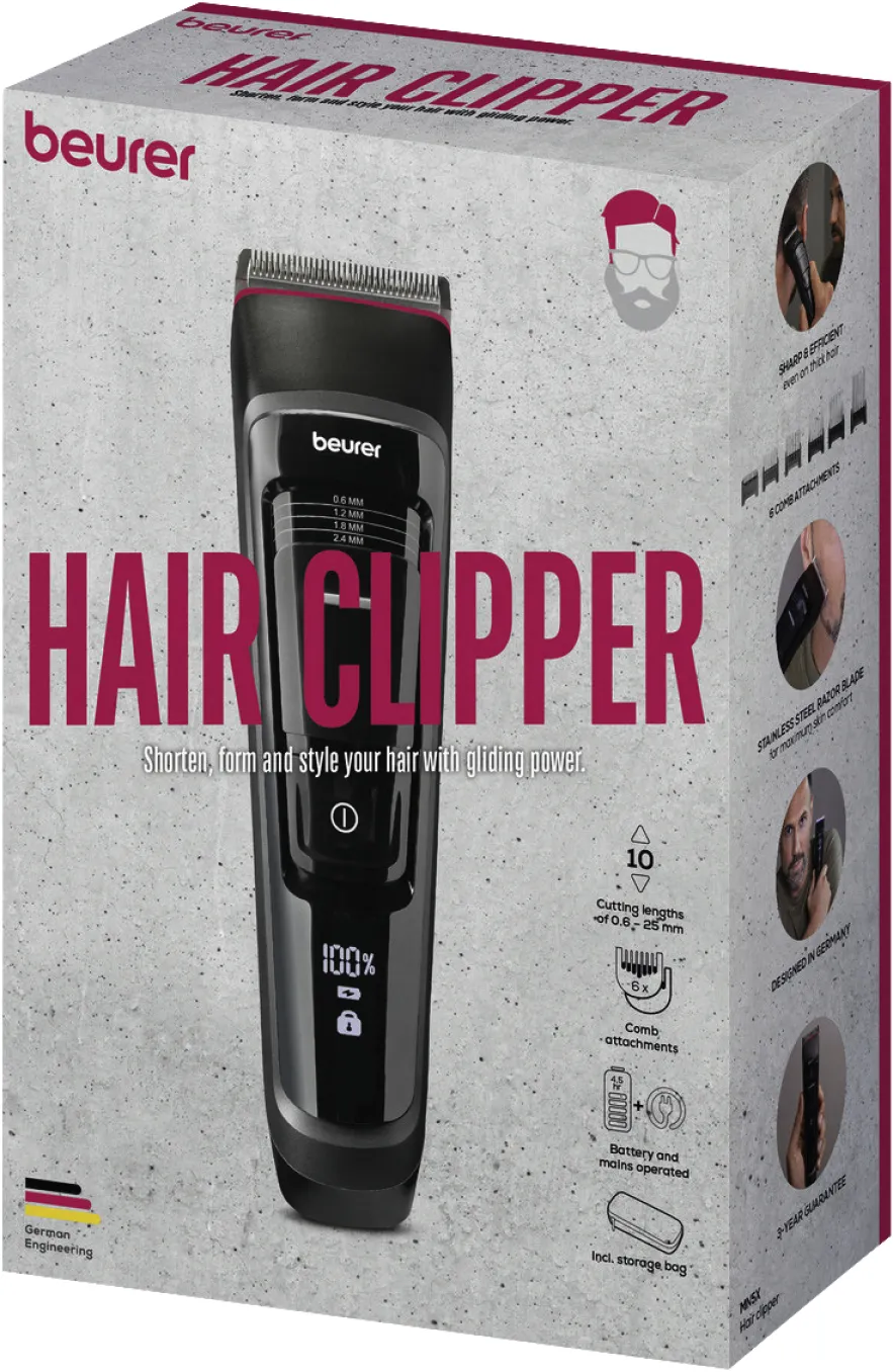 Der Beurer MN5X Haarschneider bietet professionelle Schneideleistung für zu Hause. Mit seiner hochwertigen Edelstahlklinge, dem leistungsstarken Lithium-Ionen-Akku und vielseitigen Längeneinstellungen ist er die ideale Wahl für Männer, Frauen und Familien, die Wert auf gepflegte Frisuren legen.