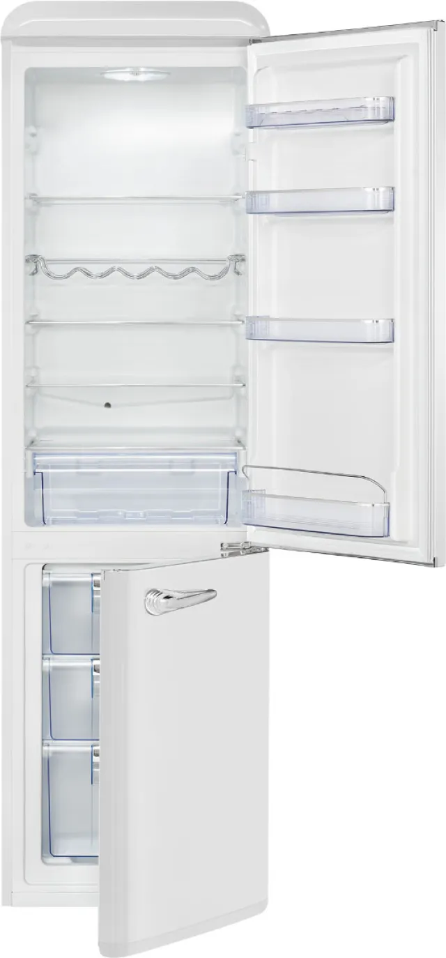Die Bomann KGR 7328.1 überzeugt nicht nur durch ihr attraktives Retro-Design, sondern auch durch ihre durchdachte Funktionalität. Die intelligente Innenaufteilung sorgt für Ordnung und Übersicht, während moderne Technik für zuverlässige Frische und niedrigen Energieverbrauch steht. Ob für den Wocheneinkauf, das spontane Dinner oder den täglichen Snack – auf diese Kühl-Gefrierkombination ist Verlass.