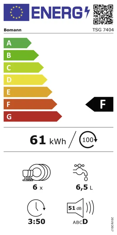 | Energieeffizienzklasse Die Skala der Energieeffizienzklasse reicht von A (höchste Effizienz) bis G (geringste Effizienz) | F |