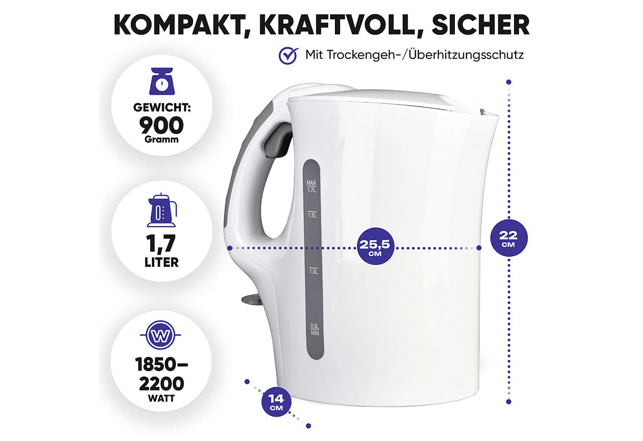 Genießen Sie zuverlässige Performance und einfache Bedienung dank hochwertigem Kunststoffgehäuse in elegantem Weiß. Die clevere Technik, kombiniert mit ausgereiften Sicherheitsmerkmalen, macht diesen Wasserkocher sowohl für Familien als auch fürs Büro zum unverzichtbaren Küchenhelfer.