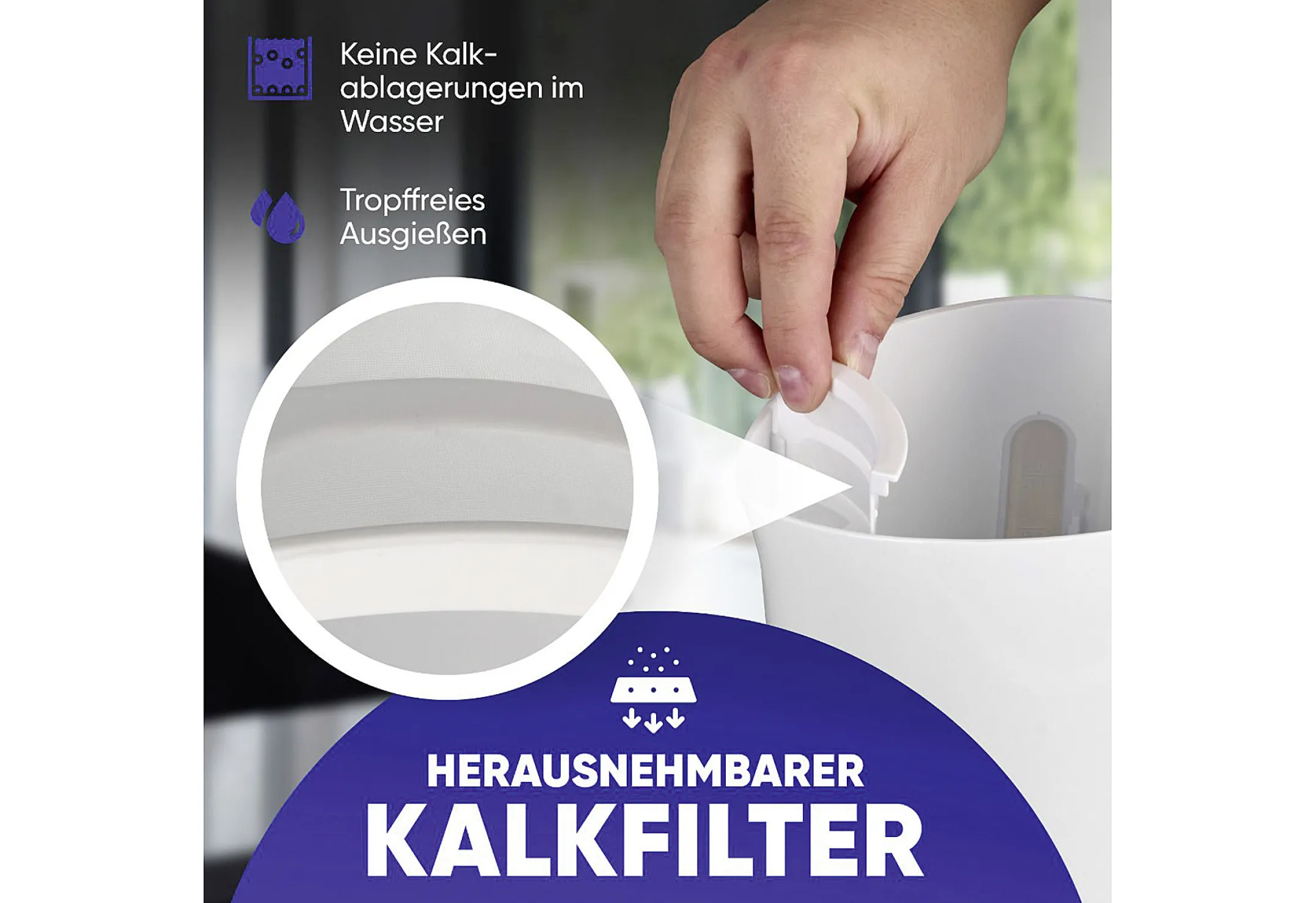 Der Kalkfilter hält Kalkpartikel beim Ausgießen zurück. So bleibt das Wasser sauberer und der Geschmack feiner. Praktisch bei hartem Wasser.
