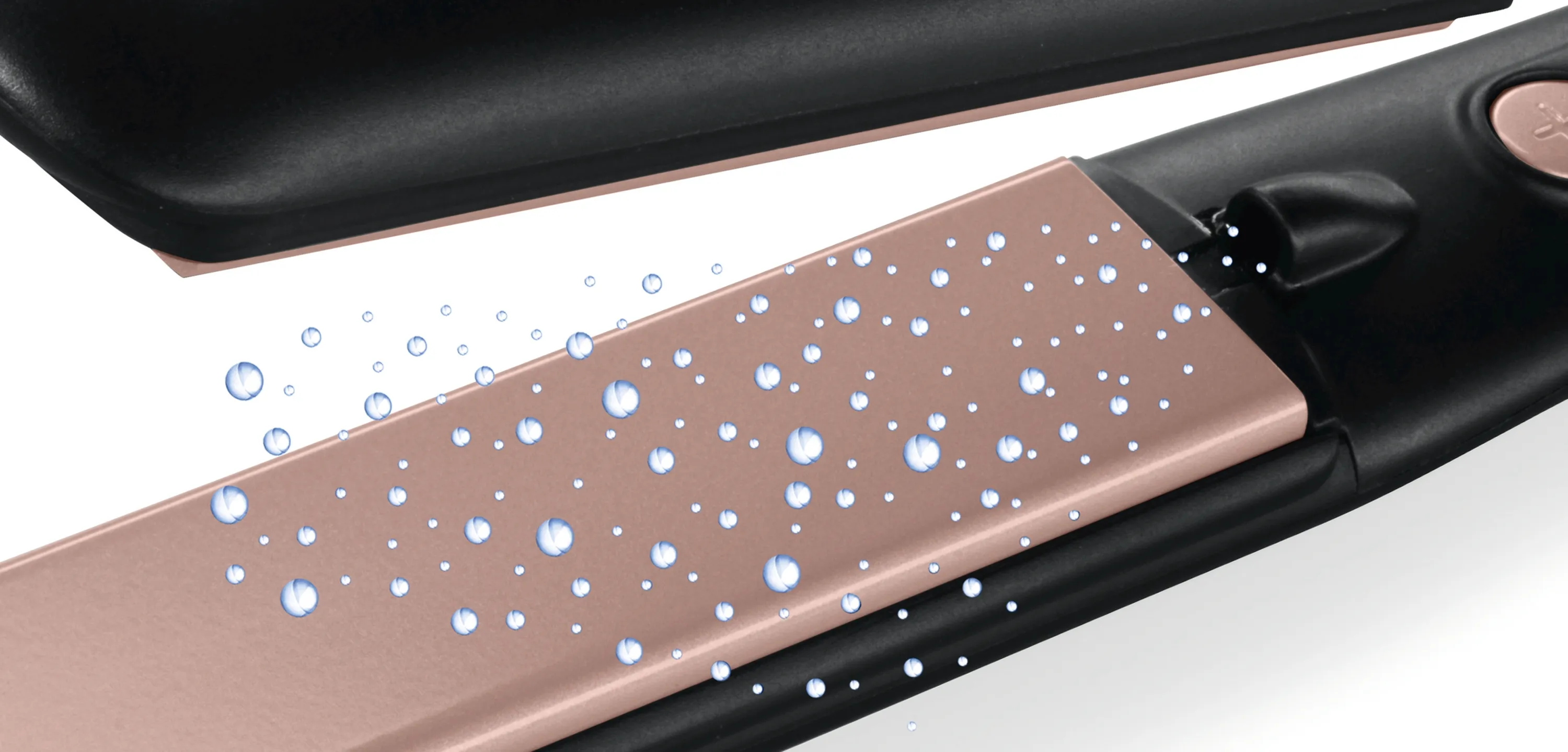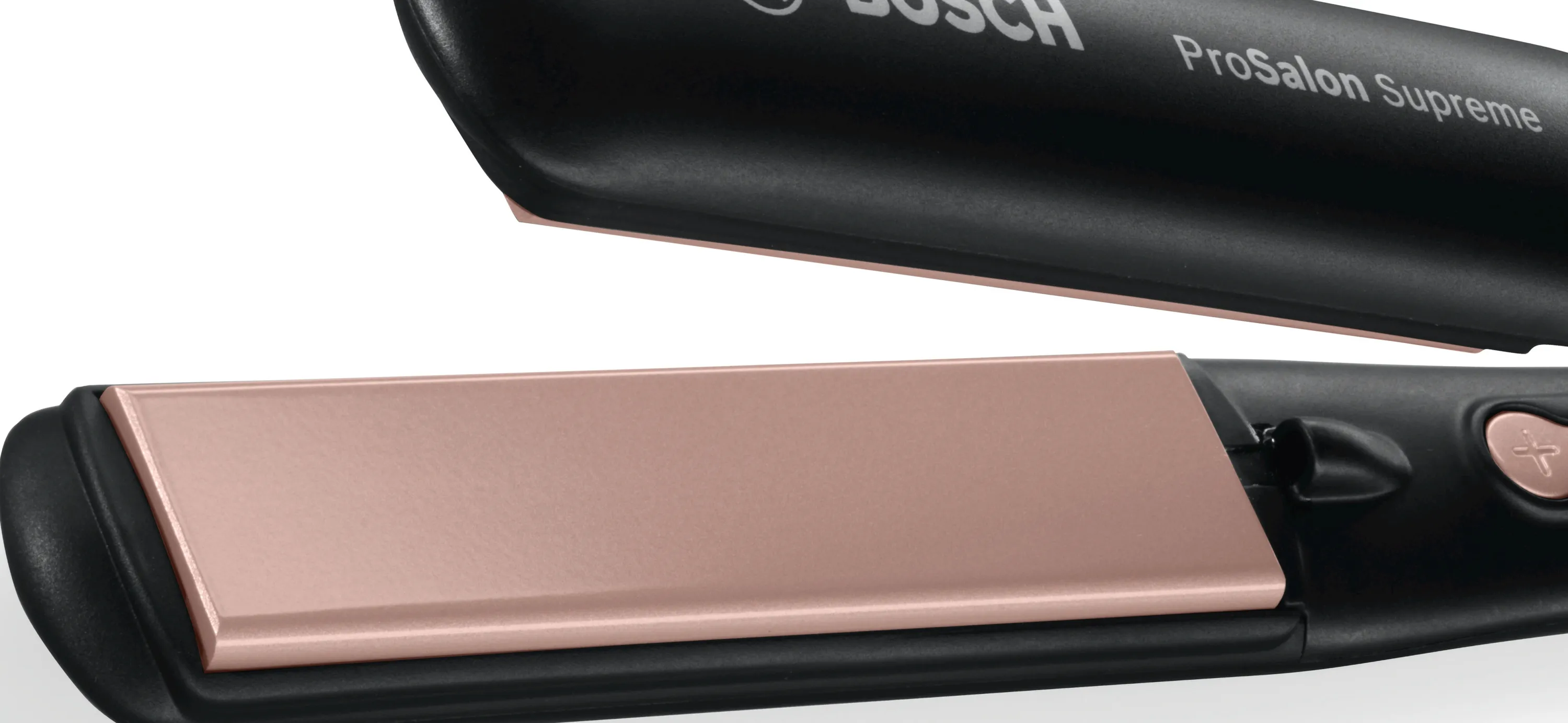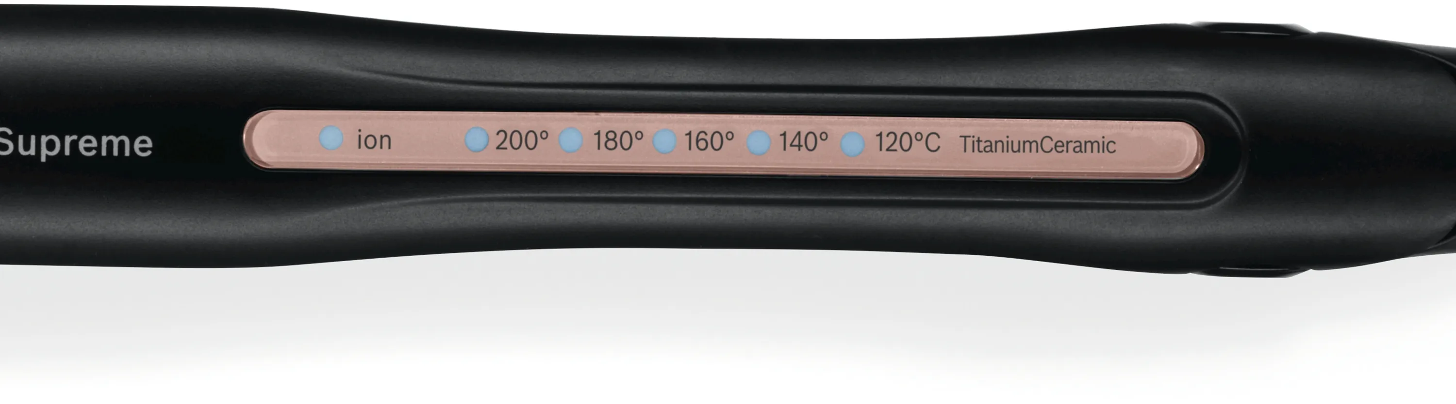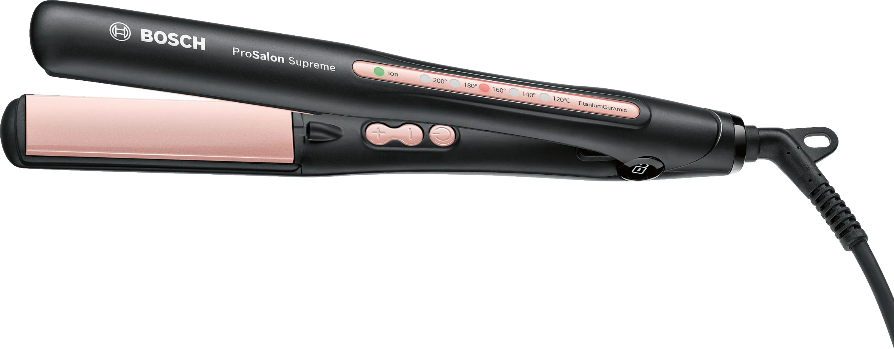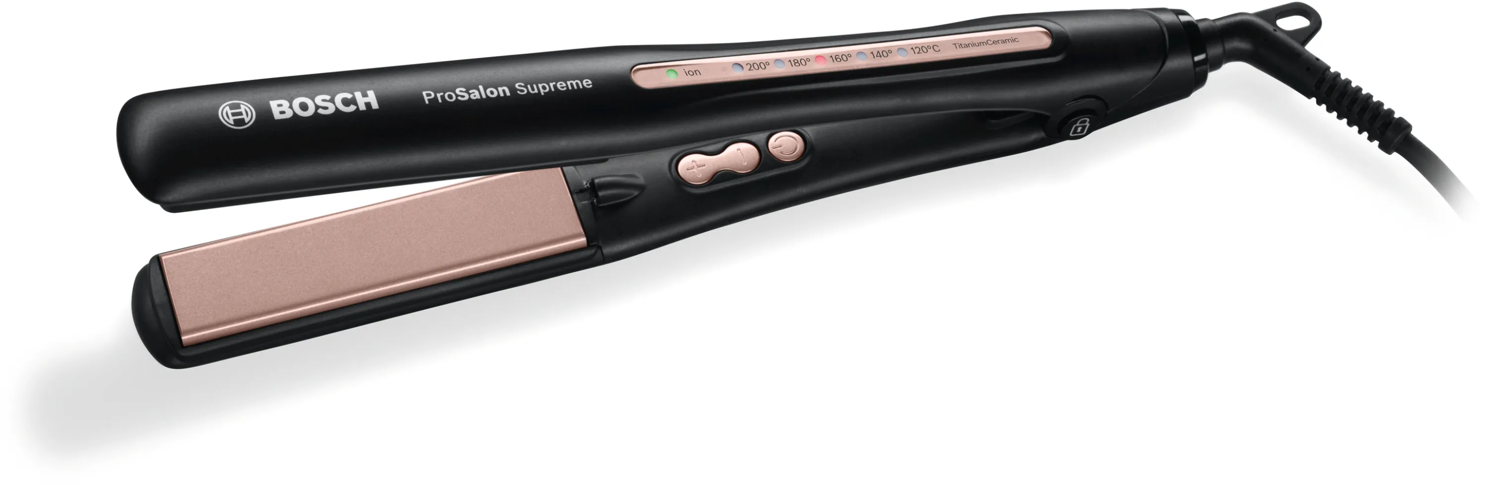 Haarglätter ProSalon Supreme Sleek&Curl, sehr lange TitaniumCeramic Heizplatten, Anti-Statik-Effekt durch Ionisation, beweglich gelagerte Platten, gleichmäßige Hitzeverteilung, Temperatur: 120-200 °C, schnelle Aufheizzeit (25 Sek.), DirectMax Funktion, 5 LED Temperaturstufen, ideale Gehäuseform, schlanker Griff, Verriegelung, Drehgelenk, 3 m langes Kabel, hitzeunempfindlich, Aufhängeöse, Zubehör: Hitzebeständige Ablagematte und 3 Haarclips, Farbe: schwarz, rosegold