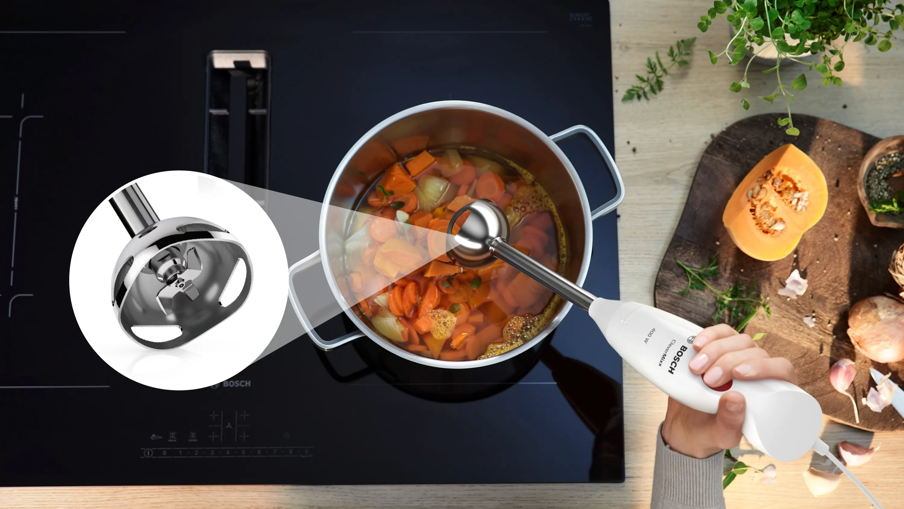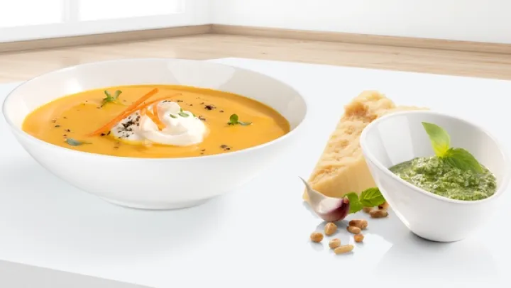 Der hochwertige Edelstahl-Mixfuß ist lebensmittelecht, geschmacksneutral und verfärbt nicht. Daher ideal für die Zubereitung von Karotten-/ oder Tomatensuppe.