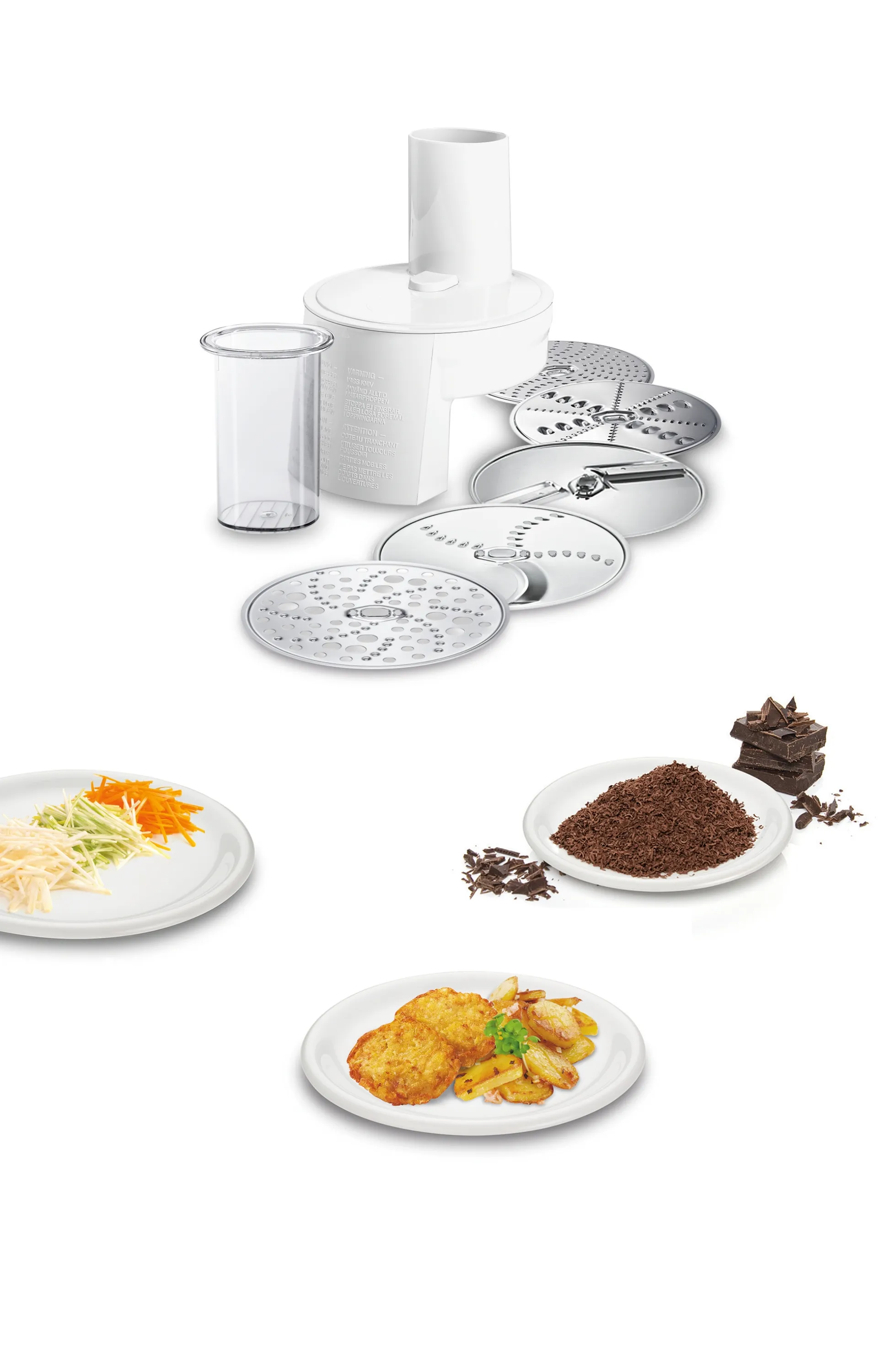 Durchlaufschnitzler inkl. 5 Edelstahlscheiben (Schneid-, Raspelwendescheibe, Reibscheibe mittelfein, Reibscheibe grob und Kartoffelpuffer-Rösti-Scheibe)