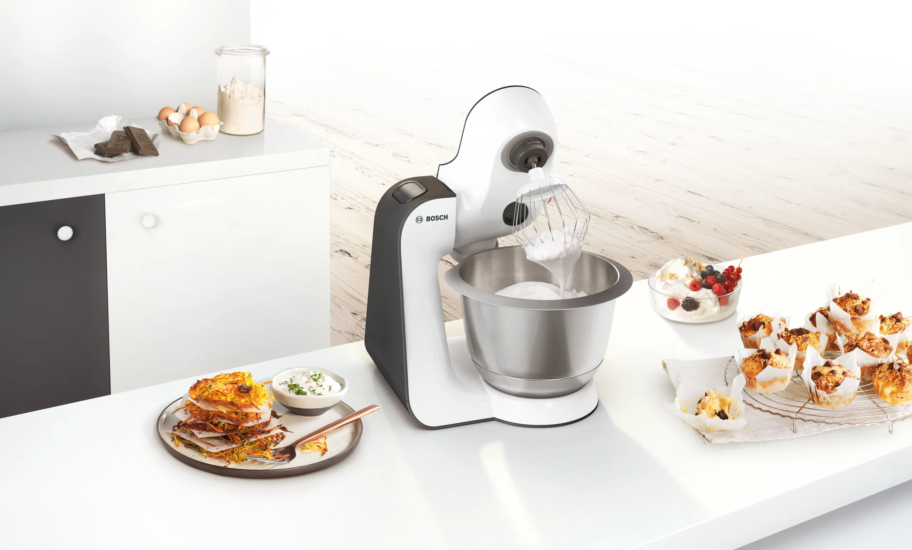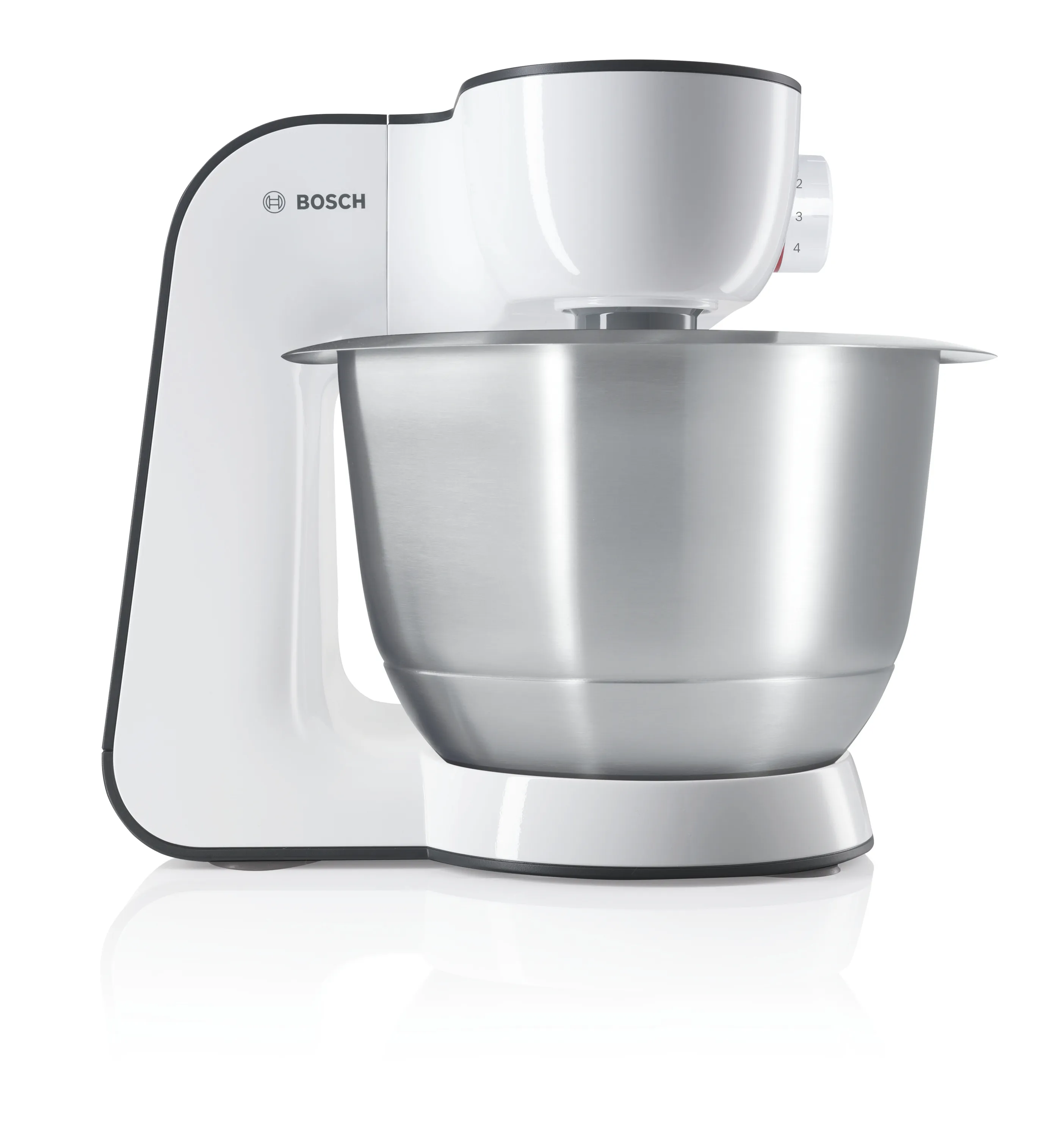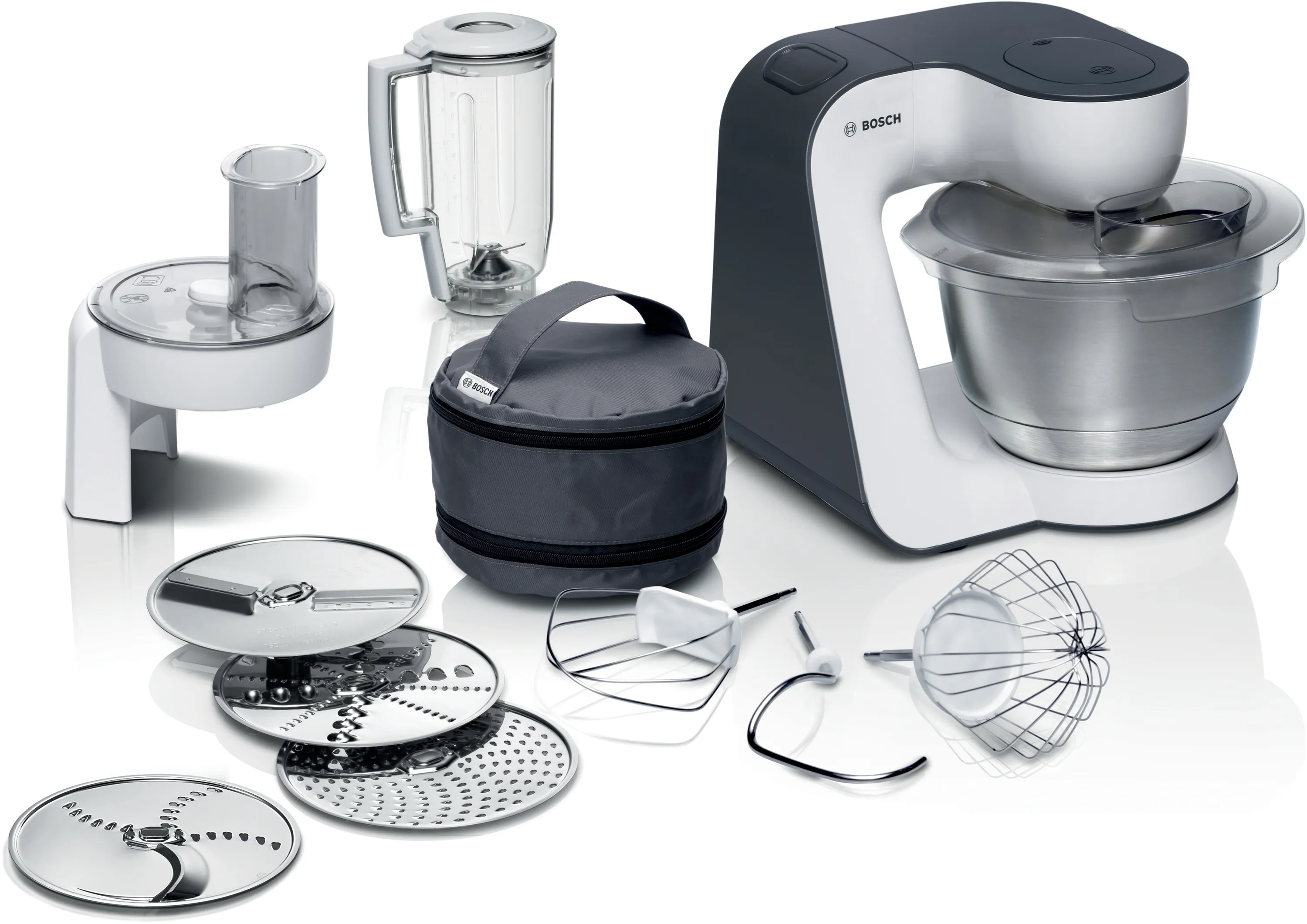 3D PlanetaryMixing, Momentstufe/Momentschalter, EasyArmLift, Sanftanlauf, automatische Parkstellung der Rührwerkzeuge, Rührschüssel mit 3,9 l Fassungsvermögen für bis zu 2 kg Rührteig / 1,5 kg Hefeteig, enthaltenes Zubehör: Knethaken mit Teigabweiser, Schlag- und Rührbesen, Durchlaufschnitzler inkl. 3 Edelstahlscheiben (Schneid-, Raspelwendescheibe, Reibscheibe mittelfein), Schneid-Raspel-Wendescheibe Edelstahl, Mixer-Aufsatz Kunststoff 1,25 l, Zubehörtasche rot, Deckel mit Einfüllöffnung, interaktive Rezept DVD, Farbe: Weiß/anthrazit
