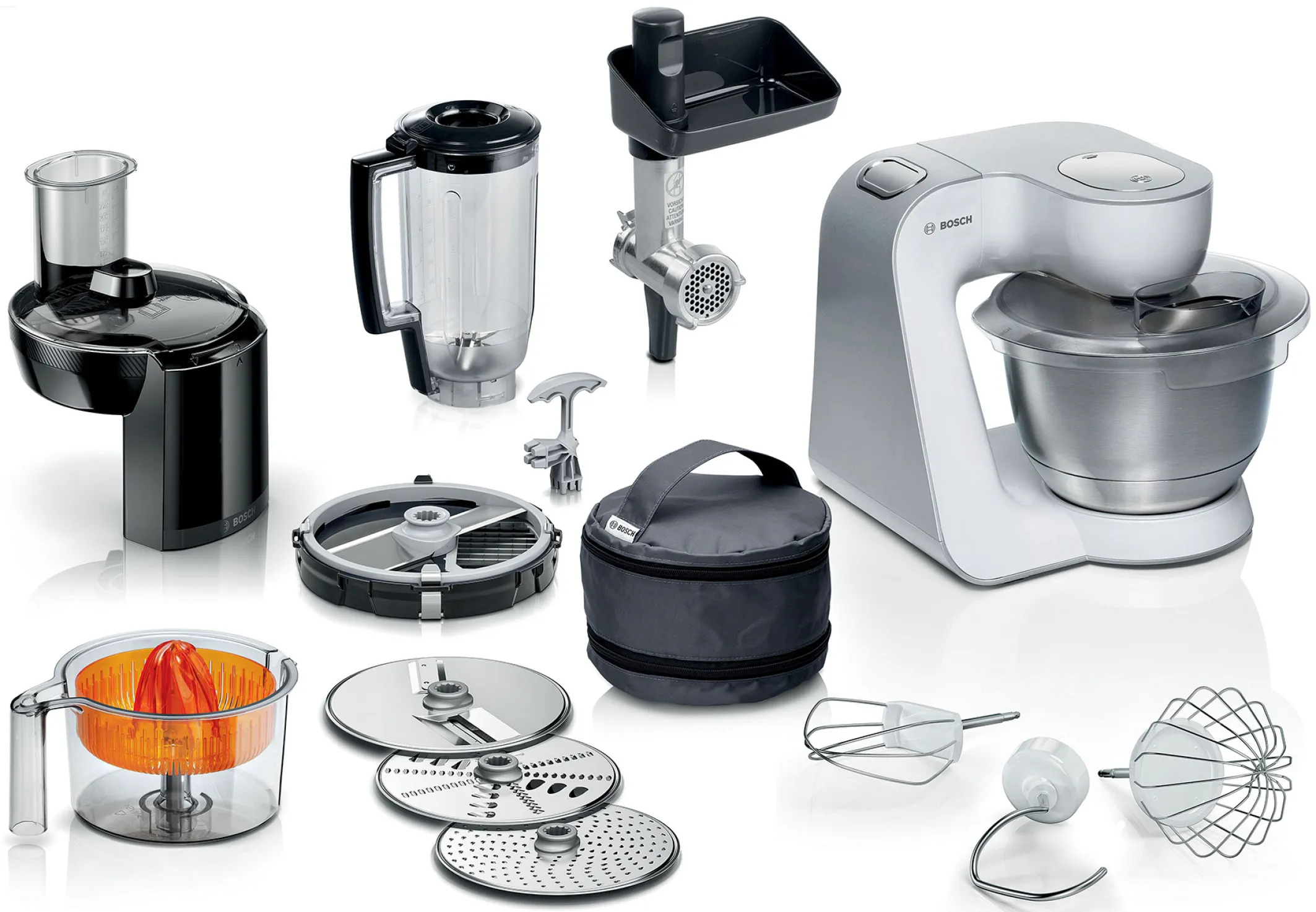 1 x Deckel, 1 x Edelstahl-Rührschüssel, 1 x Fleischwolf, 1 x Knethaken, 1 x Mixeraufsatz Kunststoff, 1 x Raspelwendescheibe grob/fein, 1 x Reibscheibe fein, 1 x Rührbesen, 1 x Schlagbesen, 1 x Schneidwendescheibe dick/dünn, 1 x Zitruspresse, 1 x Würfelschneider, 1 x Zubehörtasche dunkelgrau, 1 x Würfeleinsatz 9mm, 1 x Gitterreiniger - Werkzeug, 1 x Lochscheibe 5 mm