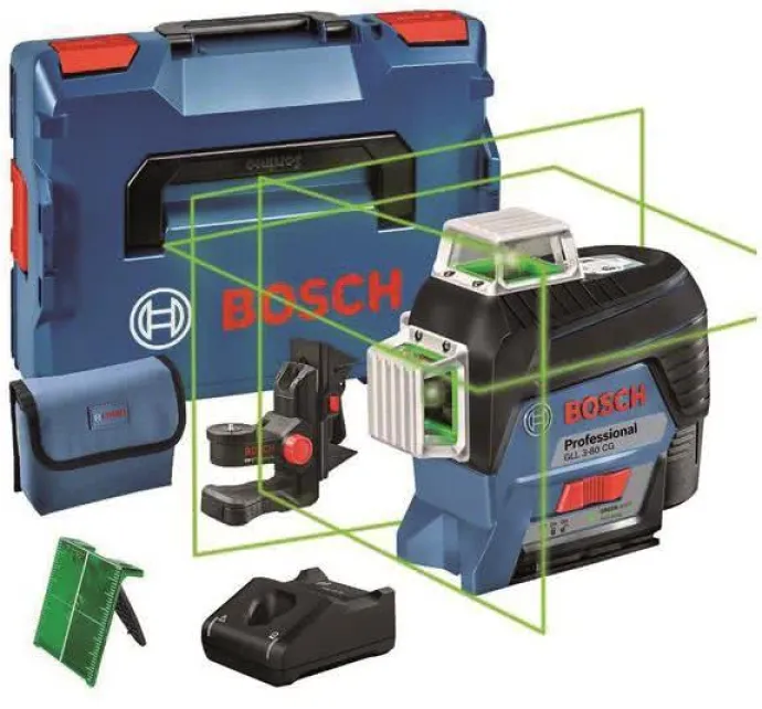 Linienlaser GLL 3-80 CG. 3 x 360°-Linien in kräftigem Grün für optimale Sichtbarkeit. Simply Connected. Helle, grüne Laserlinien bieten bis zu vierfach bessere Sichtbarkeit als rote Linien. Hohe Präzision dank CAL Guard-Überwachung und ferngesteuerter Einsatz über Bluetooth®-Verbindung zu Smartphone-App. Dank 3 x 360°-Linien gleichzeitiges Durchführen horizontaler und vertikaler Nivellierarbeiten und somit hohe Arbeitseffizienz möglich. Im Lieferumfang enthalten: L-BOXX 136 (1 600 A01 2G0), Universalhalterung BM 1 Professional (0 601 015 A01), Laserzieltafel, Tasche, 1 x Akku GBA 12V 2.0Ah (1 600 Z00 02X), Schnellladegerät GAL 12V-40 Professional (1 600 A01 9R3)