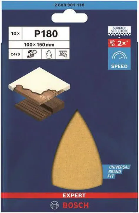Ob bei Renovierungen, Restaurierungen oder im Möbelbau: Das Bosch C470 Schleifpapier spart Zeit und überzeugt durch seine lange Standzeit. Im Set sind zehn hochwertige Schleifblätter in praktischer Dreiecksform enthalten, optimal für Multischleifer mit 100 x 150 mm Aufnahme. Die spezielle Kornorientierung ermöglicht ein aggressives Schleifverhalten, während die präzise Lochung für eine effektive Staubabsaugung sorgt. So bleibt die Arbeitsumgebung sauber und das Schleifergebnis konstant hochwertig.