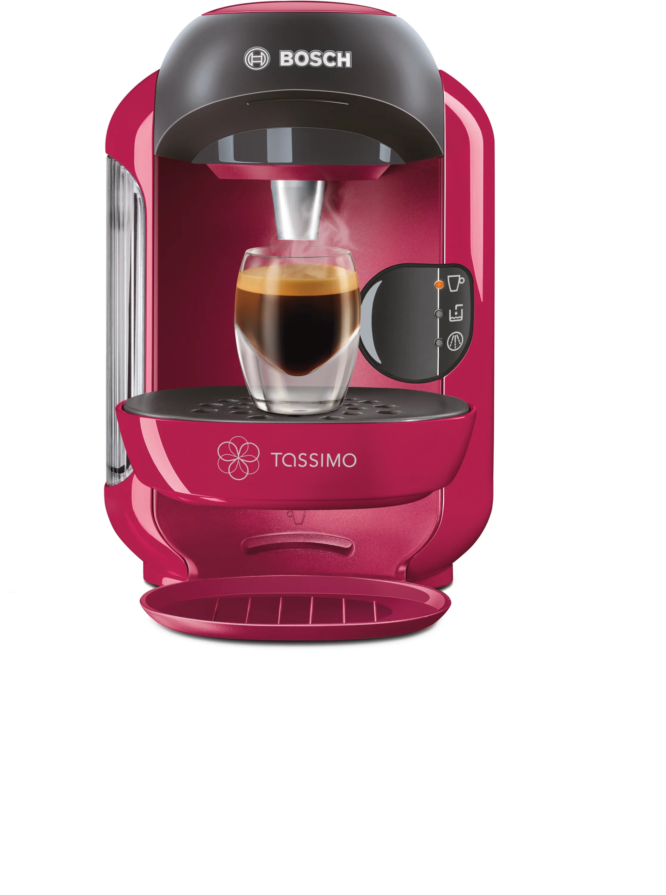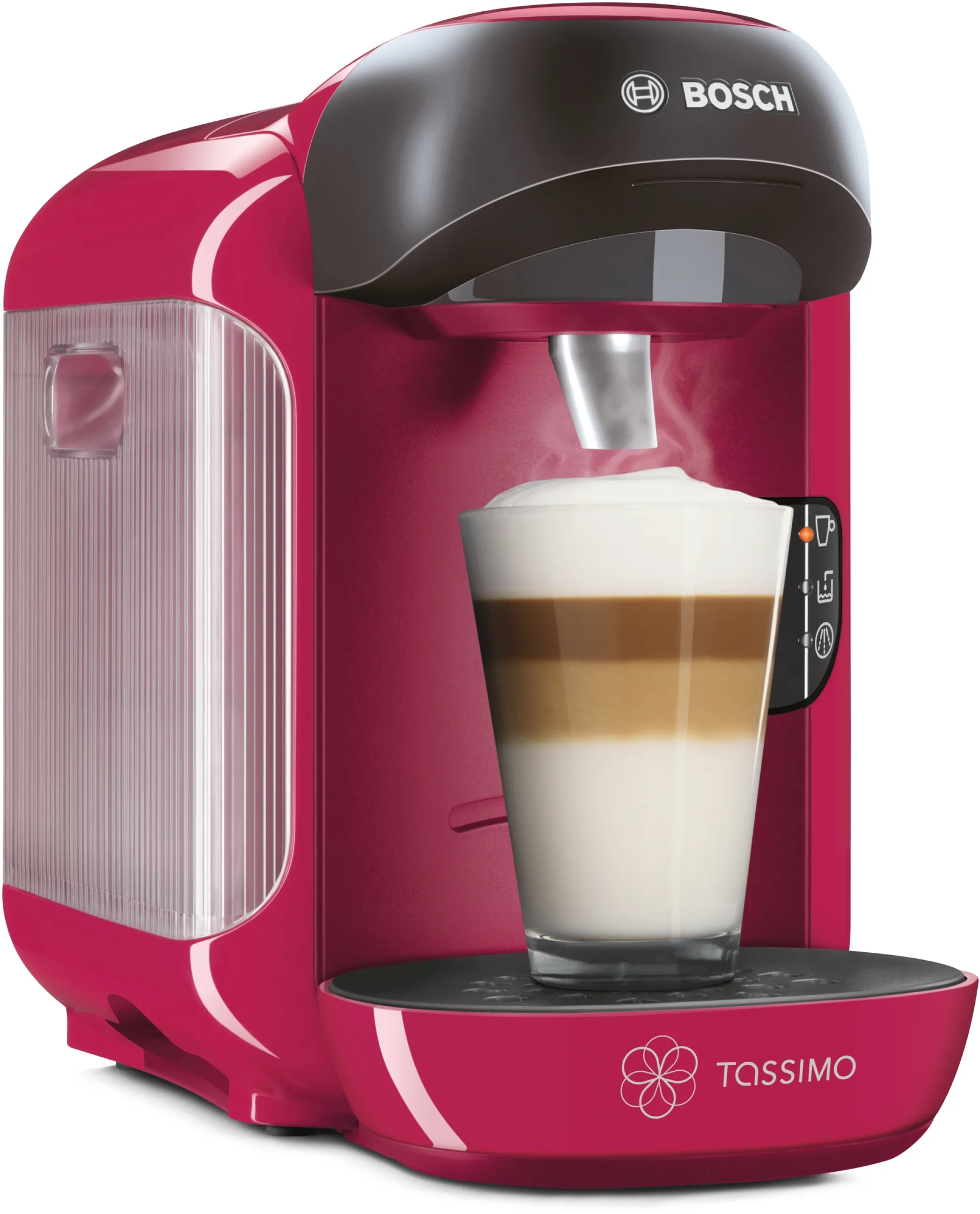 Über 40 Spezialitäten wie Espresso, Caffè Crema, Filterkaffee, Latte Macchiato, Cappuccino, heiße Kakao-Spezialitäten und Tee, INTELLIBREW(TM) (dank der patentierten Barcode-Technologie wird jedes Getränk mit der richtigen Wassermenge, Temperatur und Brühzeit perfekt zubereitet, das TASSIMO-Gerät liest den jeweiligen Barcode und brüht so das perfekte Getränk), manuelle Getränkestärke-Anpassung, autom. Dampfstoß, vollautom. keine Aufheizdauer, intuitives LED-Bedienfeld, autom. Reinigungs- und Entkalkungsprogramm, spülmaschinengeeignete Einzelteile, höhenverstellbares und herausnehmbares Tassenpodest, abnehmbarer Wassertank (0,7 l), Ein-/Ausschalter, Maße (HxBxT): 249x169x298 mm, Farbe: Pink
