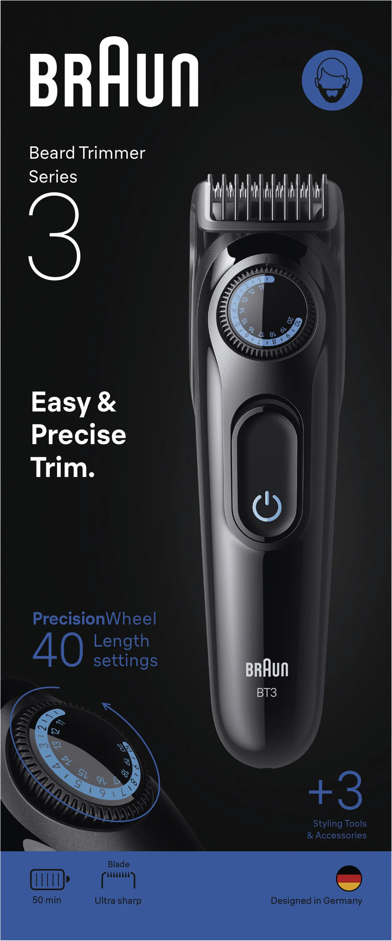Gerade in stressigen Alltagsmomenten punktet der Braun Series 3 Bartschneider durch unkomplizierte Handhabung und blitzschnelle Reinigung. Sein schlankes, robustes Design macht ihn zudem zum eleganten Highlight in jedem Badezimmer. Erleben Sie neue Möglichkeiten für Ihr Styling, sparen Sie Zeit bei der Bartpflege und genießen Sie das Gefühl eines perfekt getrimmten Bartes – Tag für Tag.