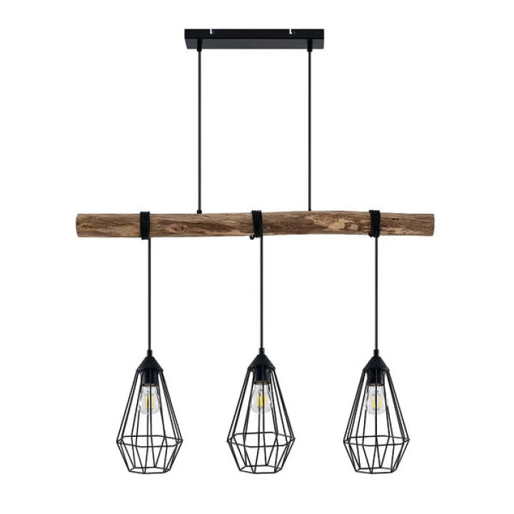 Die Leuchte verfügt über drei längliche Käfigschirme, die an einem massiven Holzbalken befestigt sind. Das offene Design setzt dekorative LED-Filament-Lampen besonders effektvoll in Szene und sorgt für ein faszinierendes Licht- und Schattenspiel. Mit ihrer klaren Formgebung wird die Pendelleuchte zum Blickfang über Esstischen, Kücheninseln oder im Wohnzimmer.
