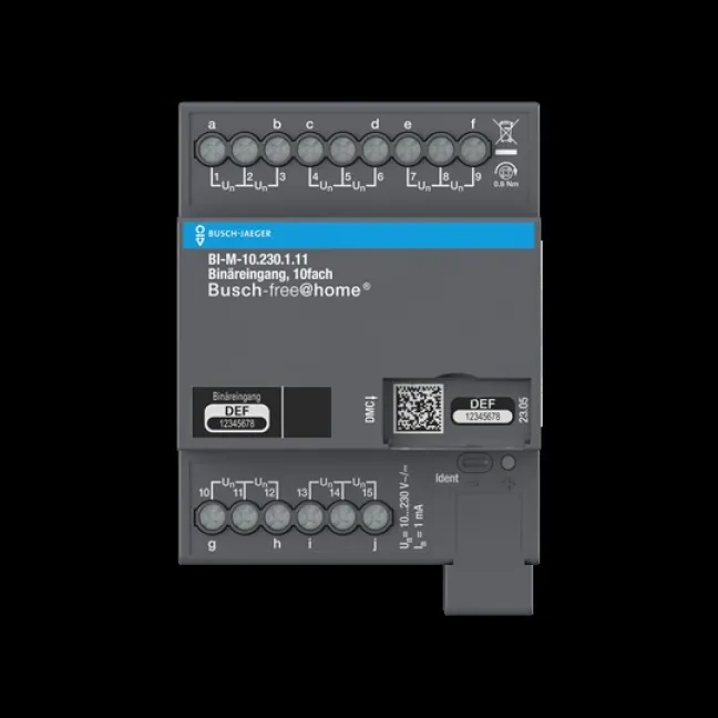 Der BUSCH-JAEGER BI-M-10.230.1.11 Binäreingang 10fach ist die ideale Lösung, wenn Sie Ihr Busch-free@home® System flexibel erweitern möchten. Dieses innovative Hutschienen-Modul ermöglicht die einfache Integration von bis zu zehn Schaltkontakten, wie z.B. Bewegungsmeldern oder Störmeldungen, und sorgt damit für mehr Komfort, Übersicht und Automatisierung in Ihrem Smart Home.