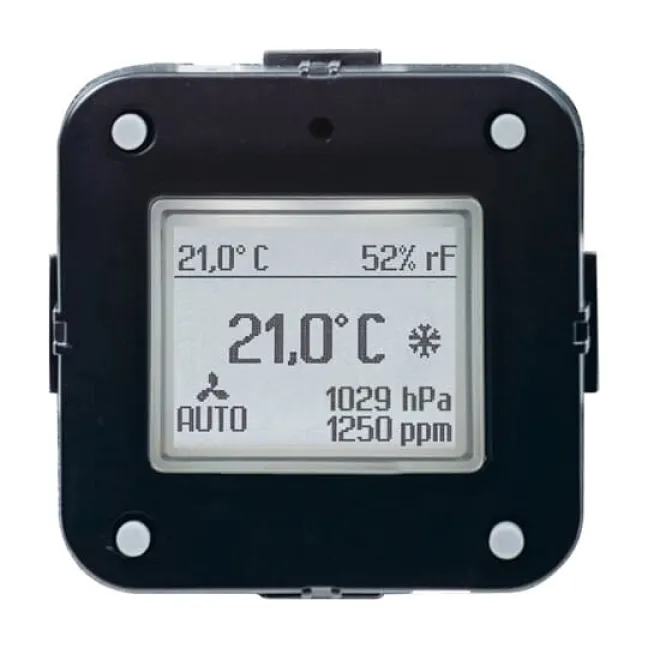 Die Bedienung ist besonders nutzerfreundlich: Über das kompakte schwarze Bedienelement können Sie Sollwerte anpassen, Statusanzeigen ablesen und zwischen verschiedenen Raumklimamodi wechseln. So verbinden Sie Komfort, Energieeffizienz und moderne Gebäudetechnik – und steigern den Wert Ihrer Immobilie.
