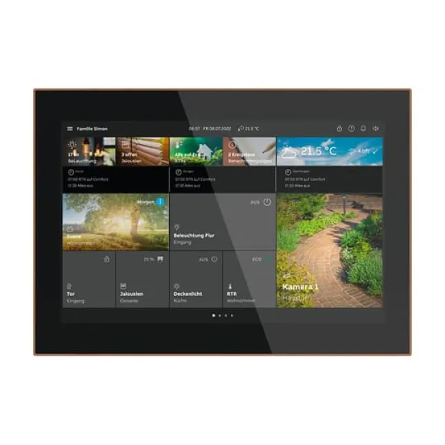 Das 10-Zoll-Touchpanel überzeugt durch seinen hochwertigen Echtmetallrahmen, ein nahezu flächenbündiges, schlankes Erscheinungsbild (nur 14 mm Aufbauhöhe) und wahlweise schwarzes oder weißes Glas. Der brillante IPS-Bildschirm (1280 x 800 Pixel) sorgt für eine gestochen scharfe Darstellung und macht die Bedienung besonders einfach.