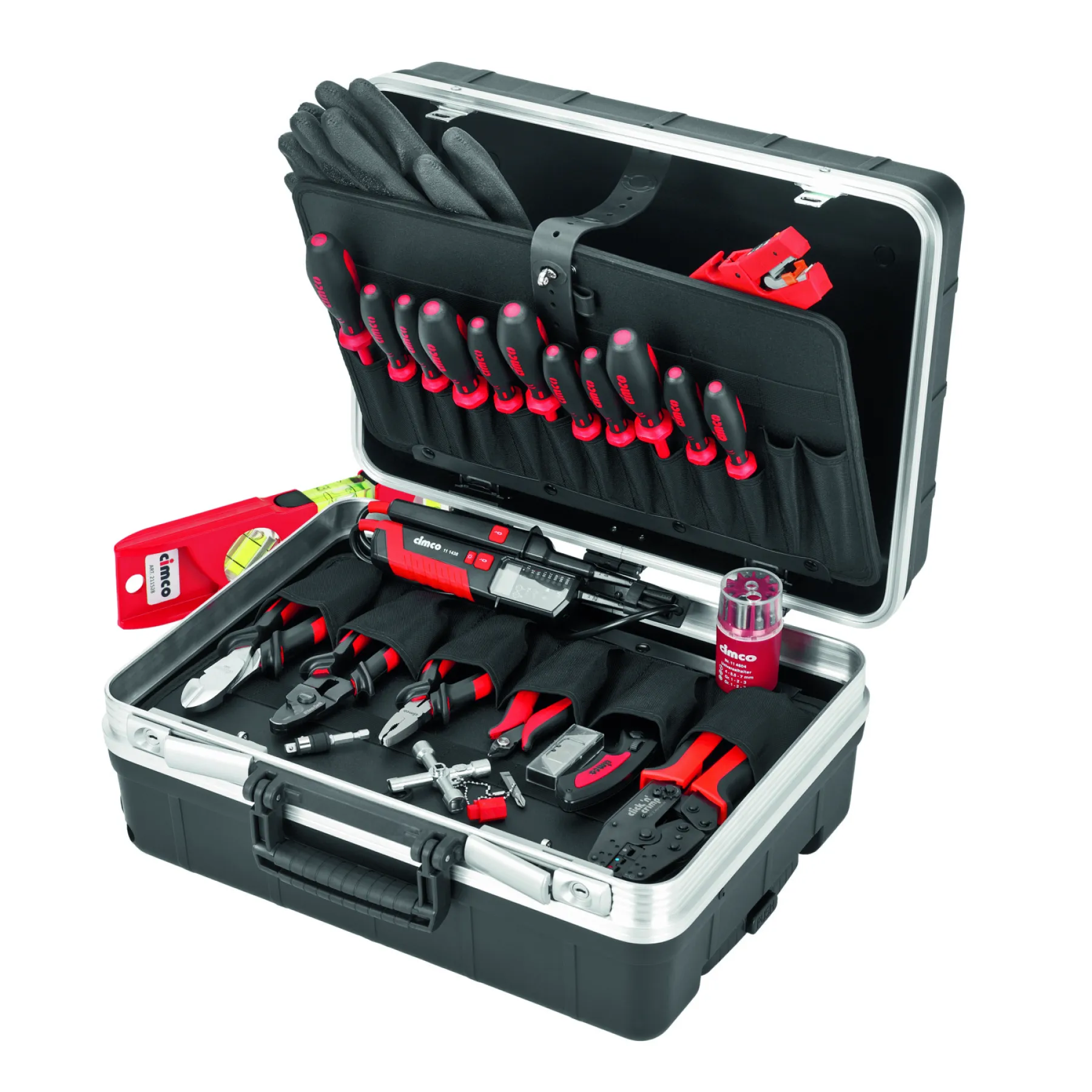 Robuster Werkzeugkoffer mit Trolleyfunktion aus stoßfestem Kunststoff mit stabilem Aluminiumrahmen, Zwei robuste, abschließbare Kippschlösser, Bodenschale im Spritzgussverfahren hergestellt mit zahlreichen Unterteilungsmöglichkeiten, Herausnehmbare Bodenabdeckplatte, Herausnehmbare Bodenabdeckplatte, einseitig mit Werkzeugtaschen bestückt, Herausnehmbare Werkzeugtafel mit Dokumentenfach und einer Vielzahl von Werkzeugeinsteckfächern, Größe: L x B x H: 395 x 455 x 205 mm, Gewicht: leer 3.450 g. Werkzeugkoffer-Bestückung: 1 x VDE-Kabelschere, für Kabel 18 mm², 1 x 1000 V Kraft-Seitenschneider, 200 mm , 3 x VDE-Schlitz-Schraubendreher SLIM , 2 x VDE-Schraubendreher mit Kombiprofil SLIM , 2 x VDE-Kreuzschlitz-Schraubendreher SLIM , 4 x VDE-TX®-Schraubendreher SLIM, 1 x Elektronik-Seitenschneider ohne Schneidwate, 132 mm , 1 x Universal Schaltschrankschlüssel, 1 x Profi-Schaltschrank-Wasserwaage, 250 mm , 1 x Automatische Abisolierzange für lexible Leiter, 1 x Aderendhülsenpresszange , 1x Telefonzange gebogen, 200mm , 1 x Schraubenzange, 160 mm