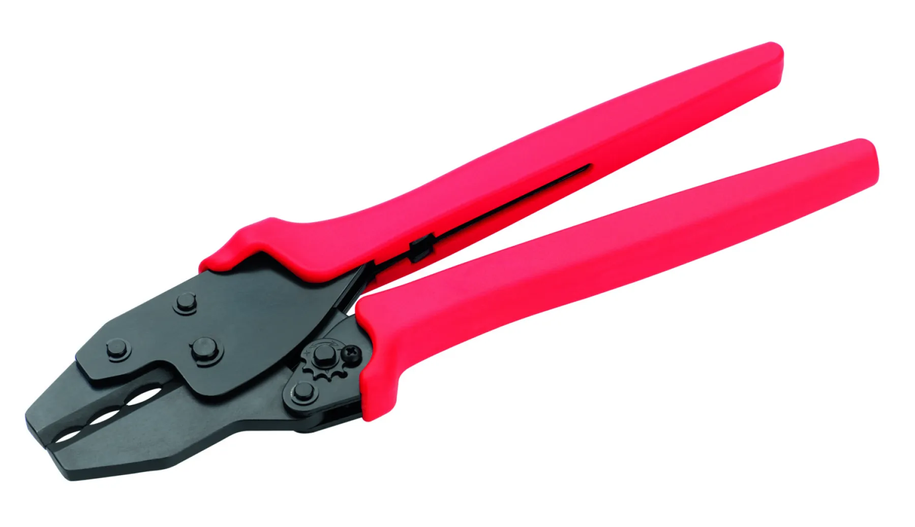 Presszangen für isolierte Kabelschuhe, hebelübersetzt, mit Ratschenmechanik und nachstellbarer Sperrvorrichtung (Druckpunktentriegelung), Doppelpressung