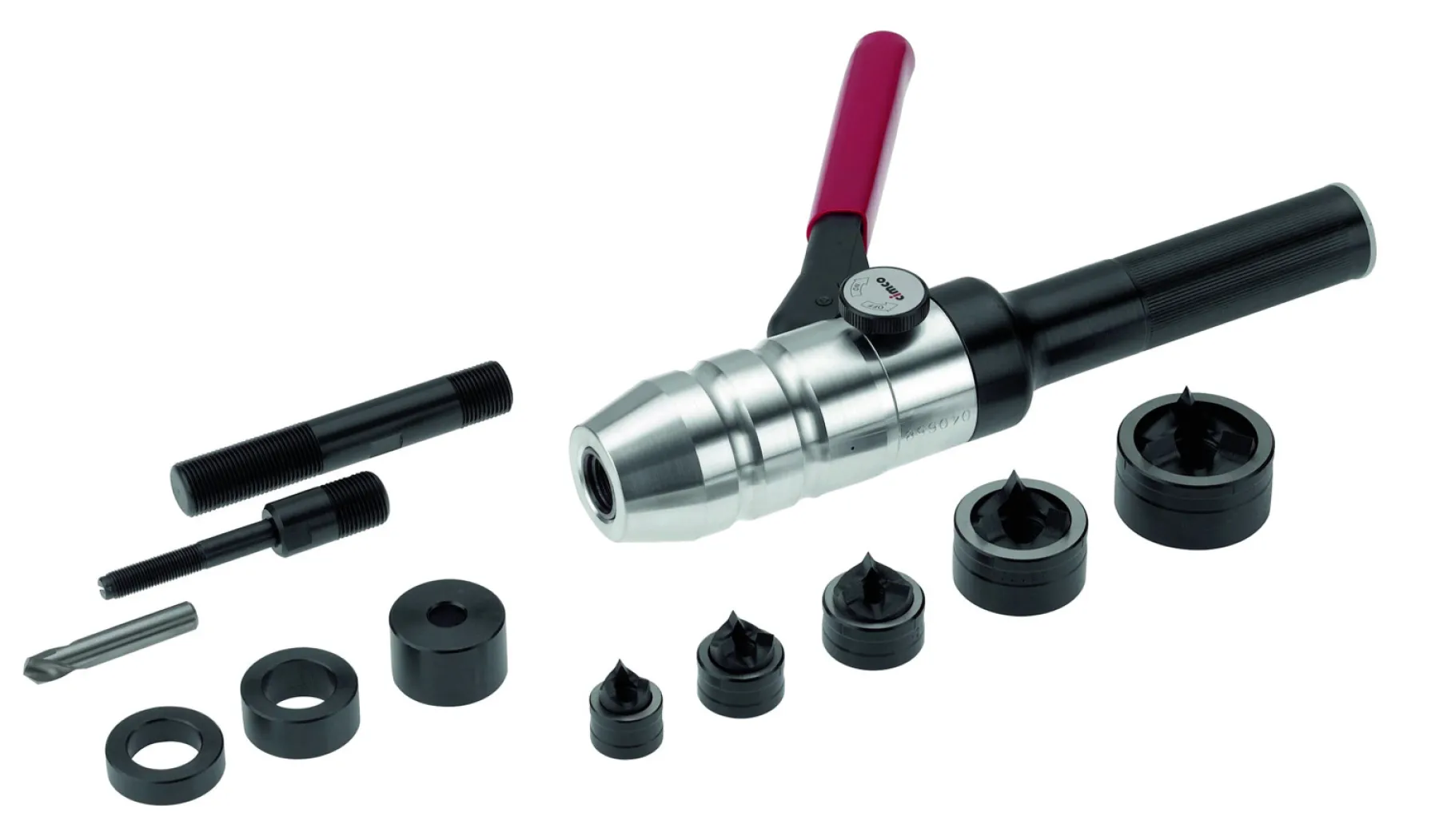 Schraublocher-Sätze Diamant 12-teilige Schraublocher-Sätze inklusive Handstanze und Zubehör Wahlweise mit einer Handstanze gerade oder Handstanze 90 Grad abgewinkelt geeignet für Stahlblech (ST 37), Kunststoff und Aluminium Betätigung hydraulisch Ausführung bestehend aus je fünf Spalt-Stempeln und Matrizen, Hydraulikschraube (2 Stück), Vorbohrer und Distanzbuchsen-Satz (3-teilig) Aufbewahrung in praktischem, stabilem Kunststoff-Koffer Nennmaß metrisch mm 16 20 25 32 40