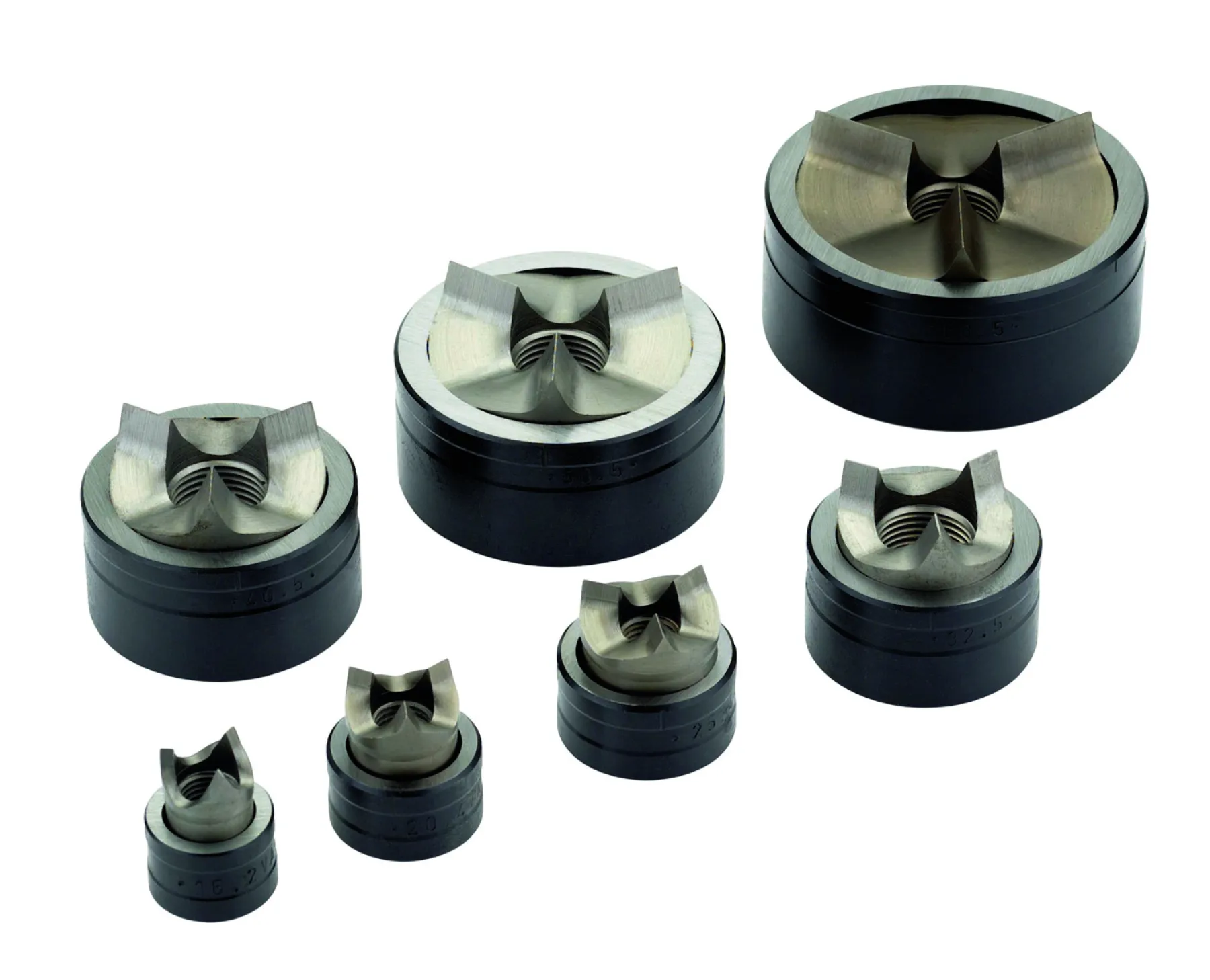 Schraublocher-Sätze Diamant Schraublocher-Sätze bestehend aus Spalt-Stempeln und Matrizen Wahlweise mit fünf oder sieben verschiedenen Größen geeignet für Edelstahl (VA) Stahlblech (ST 37), Kunststoff und Aluminium Betätigung manuell und hydraulisch Ausführung bestehend aus Spalt-Stempeln und Matrizen Aufbewahrung in praktischem, stabilem Kunststoff-Koffer M 16 M 20 M 25 M 32 M 40 M 50 M 63