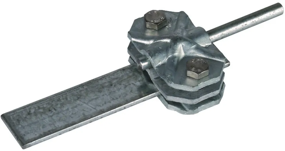 Die DEHN 454000 Verbindungs-/Trennklemme aus feuerverzinktem Stahl ist die ideale Lösung für das sichere und effiziente Verbinden sowie Trennen von Ableitungen mit Erdeinführungen in Blitzschutz- und Erdungssystemen. Dank der robusten dreiteiligen Ausführung mit Zwischenplatte bietet dieses Qualitätsprodukt eine ausgezeichnete Verbindung für Rund- und Flachleiter und sorgt nachhaltig für zuverlässige Kontinuität in Ihren Anlagen.