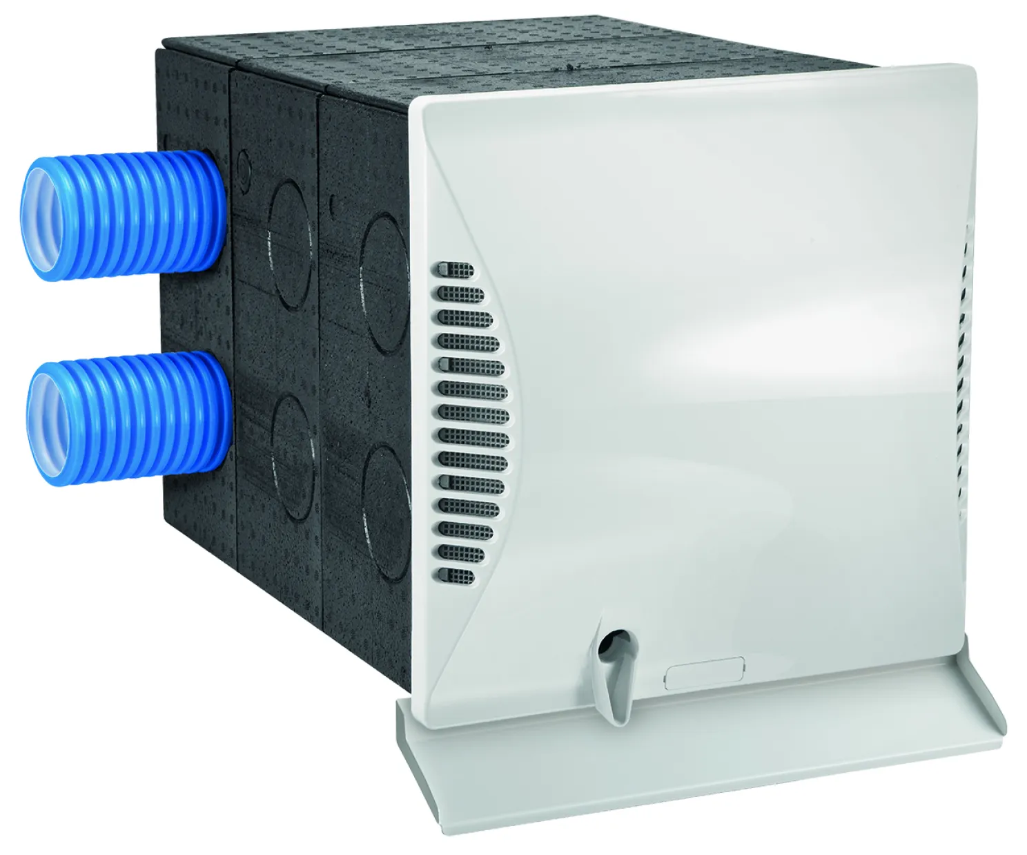 Dank der quadratischen Bauform (320 x 320 mm Frontmaß, 480 mm Tiefe) lässt sich die Wandhülse einfach an verschiedene Wandstärken von 420–480 mm anpassen. Der integrierte Nebenraumanschluss erlaubt die komfortable Belüftung eines angrenzenden Raumes über ein DN75-Lüftungsrohr – ideal für Wohnbereiche, Büros oder kleinere Gewerbeobjekte, in denen eine flexible Luftführung gefragt ist.
