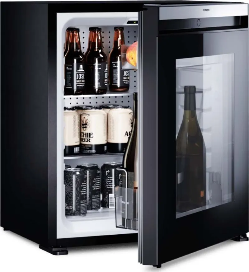 Kompressor-Minibar, rechtsseitiges Scharnier, Glastür, 60-l-Klasse - Nicht bloß eine stilvolle Minibar, sondern eine moderne Zimmerausstattung. Diese 60-l-Klasse Kompressor-Minibar vereint leistungsstarken Kühlkomfort mit hervorragender Energieeffizienz. Ihre transparente Glastür ist ein attraktiver Blickfang und fördert den Verkauf der Minibar-Artikel.