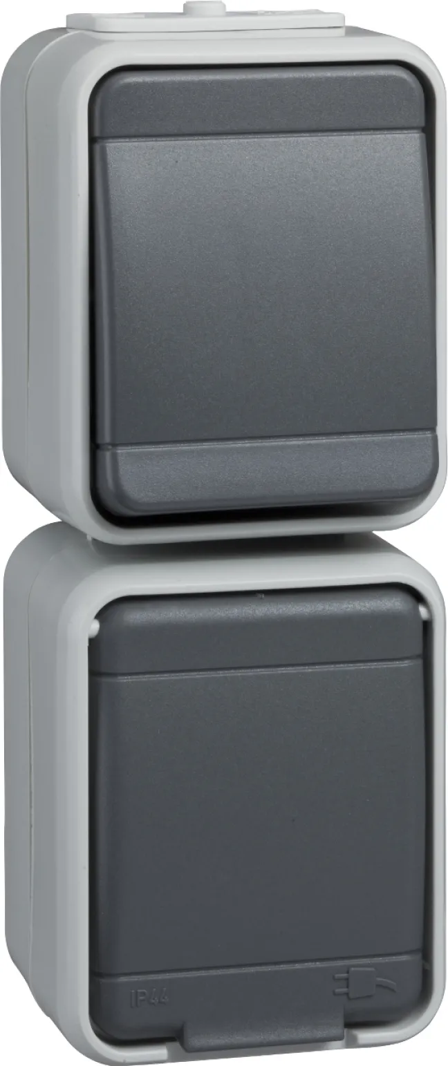 Die ELSO AP44 Schalter-Steckdosen-Kombination (Art.-Nr. 448629) vereint einen zuverlässigen Wechselschalter mit einer robusten SCHUKO-Steckdose in einem platzsparenden, senkrechten Gehäuse. Dank der spritzwassergeschützten Ausführung (IP44) eignet sich das Set ideal für Feuchträume, Keller, Garagen, Werkstätten oder überdachte Außenbereiche. Die moderne, licht-/basaltgraue Farbgebung (RAL 7035) und die matte Oberfläche sorgen für eine dezente Optik, die sich harmonisch in jede Umgebung einfügt.