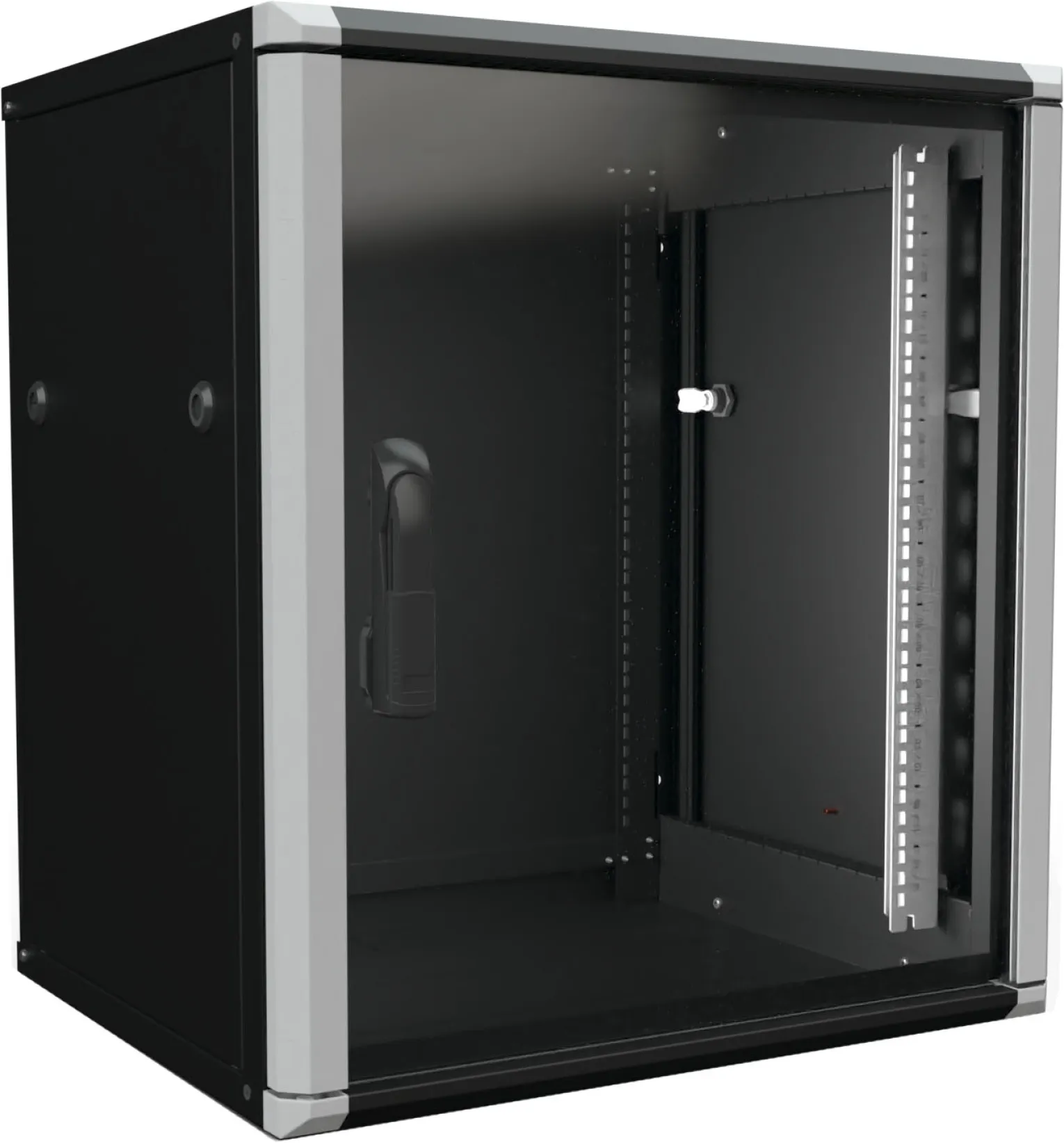 Mit 12 Höheneinheiten (HE) und einer Tragkraft von bis zu 50 kg bietet der Enoc Netzwerkschrank ausreichend Platz für aktive und passive Komponenten wie Switches, Patchpanels, USVs oder Medientechnik. Die abschließbare ESG-Glasfront mit Schwenkhebelgriff sorgt für Sicherheit und ermöglicht jederzeit den Überblick über den Schrankinhalt. Der Türanschlag ist wahlweise rechts oder links montierbar, die Seitenwände lassen sich werkzeuglos abnehmen.