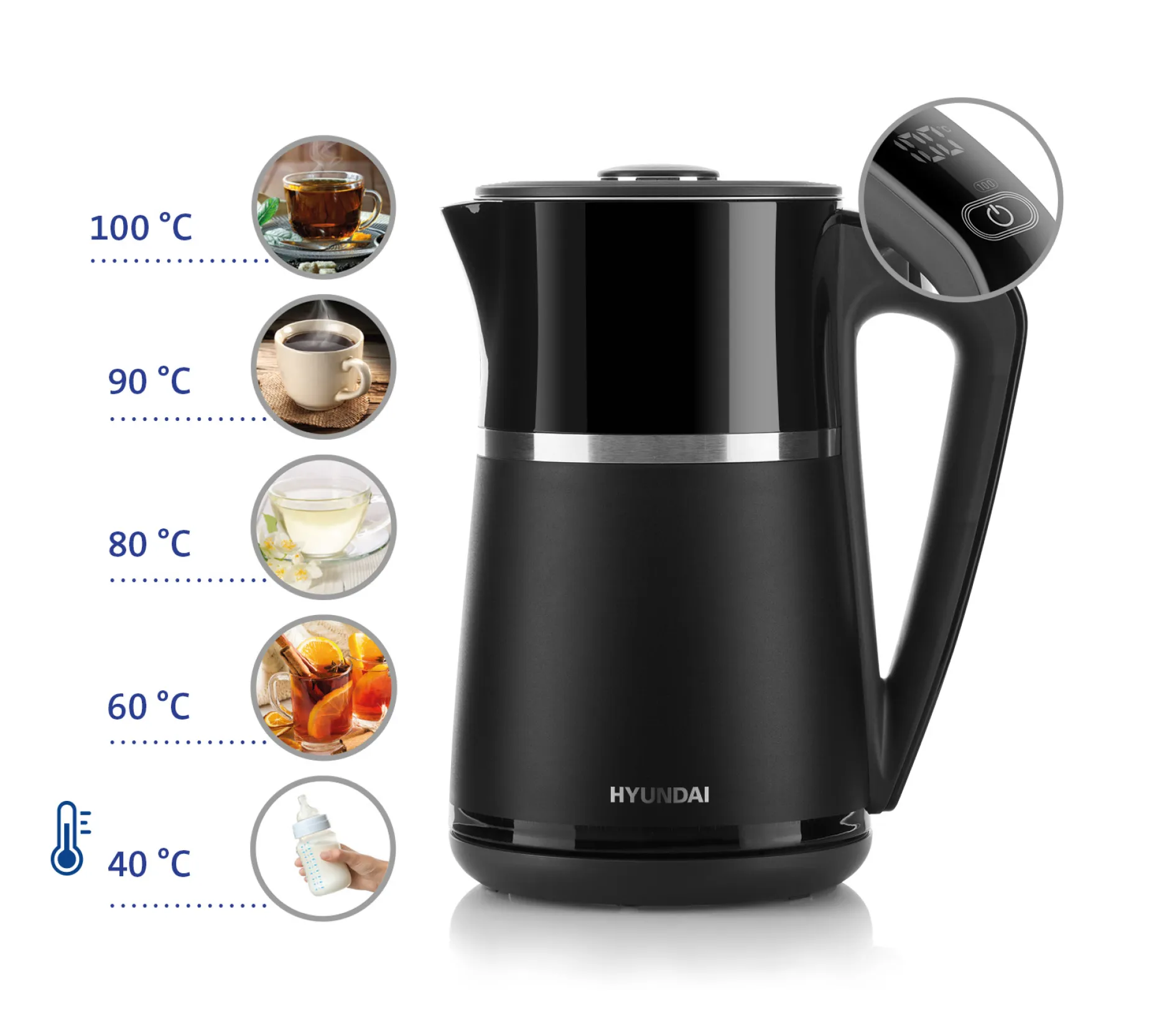 Hyundai Wasserkocher VK309, Edelstahl 1,7l, stufenlose Temperaturregelung 40–100°C