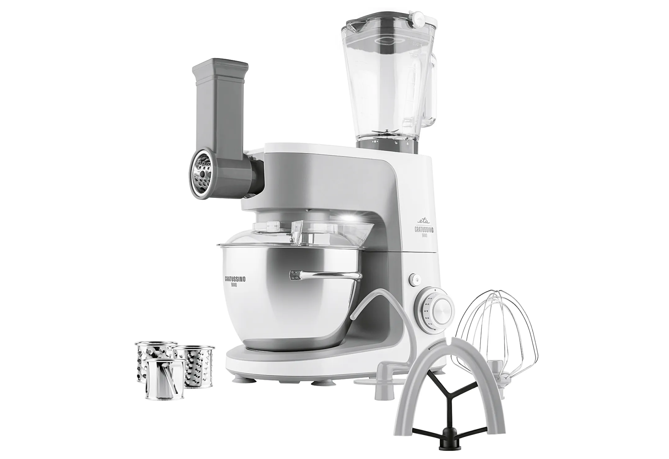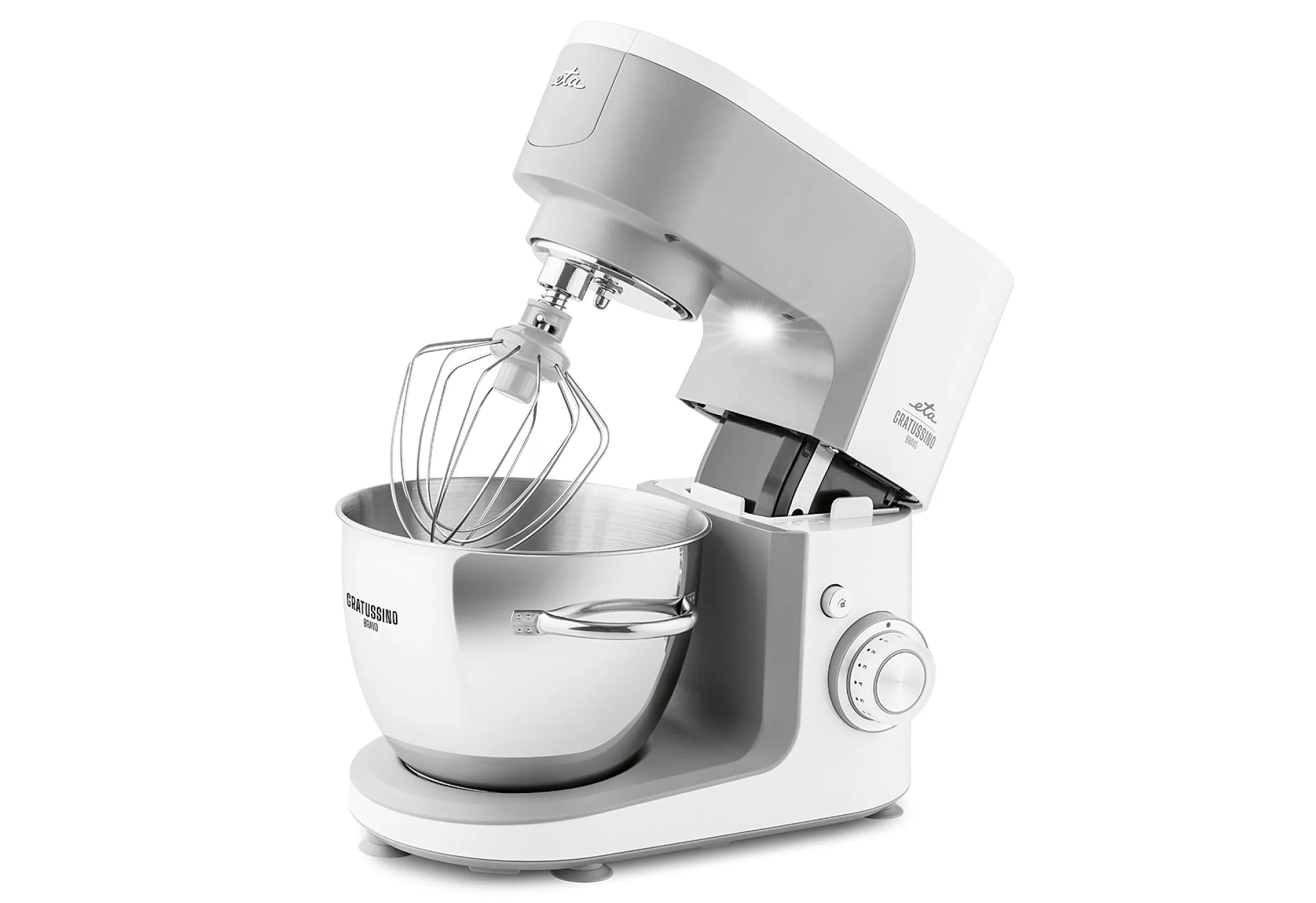 Die multifunktionale Küchenmaschine ETA Gratussino Bravo III mit Metallgetriebe und viel Zubehör kann schlagen, mischen und kneten . Sie reibt auch Gemüse und mischt mühelos gesunde Smoothies, Suppen und köstliches Eis . Es werde Licht! - Das integrierte Licht bringt alle Köstlichkeiten, die Sie in der Küche zum Leuchten bringen, zum Leuchten. Dank des Lichts haben Sie den Inhalt des Behälters immer im Blick. Planeten-Mischsystem - Der leistungsstarke 1200W-Motor mit Stabilisator hält die eingestellte Geschwindigkeit auch bei hoher Belastung. Seine lange Lebensdauer wird durch Metallgetriebe und stufenlose Geschwindigkeitsregelung gewährleistet. Die rutschfesten Füße erhöhen die Stabilität der Küchenmaschine auf der Arbeitsfläche. Der unnötige Teil des Kabels stört dank des Platzes zum Aufwickeln nicht. Zubehör inklusive: Edelstahlschüssel mit einem Fassungsvermögen von 4,5 l und durchsichtigem Deckel, Knethaken, Schneebesen FitForOne, Flexi-Quirl, Raspelaufsatz mit 4 Trommelraspeln, Stampfer, Glas-Mixer 1,5 l