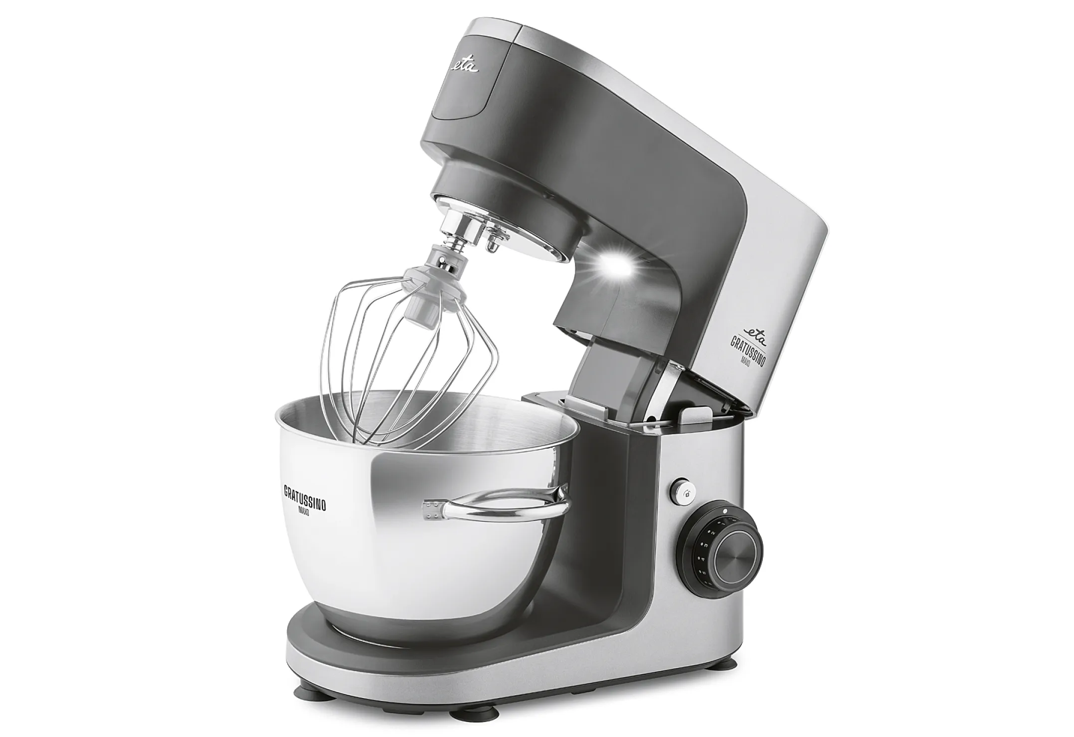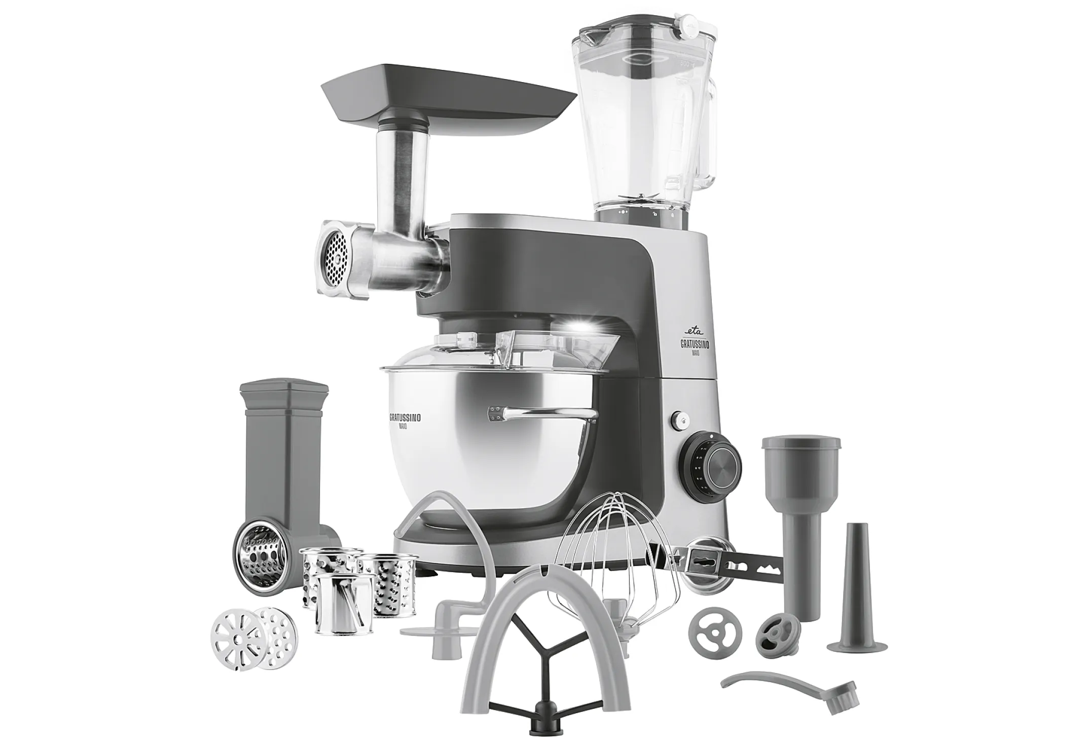 Bringen Sie mehr Komfort in Ihre Küche und erleichtern Sie sich das Kochen mit der neuen Küchenmaschine ETA Gratussino III Maxo 3023 90020. Ausgestattet ist sie mit einem Motor mit einer Leistungsaufnahme von 1200 W für die zuverlässige und schnelle Verarbeitung selbst komplexester Rohstoffe. Dank der planetarischen Bewegung, was bedeutet, dass es zu einer gegenläufigen Bewegung des Kopfes der Küchenmaschine und der Mischvorrichtung kommt, garantiert Ihnen das Gerät ein hervorragendes Ergebnis. Die Küchenmaschine ist ausgestattet mit einer Schale aus langlebigem rostfreiem Stahl mit dem Volumen von 4,5 l, die sich für einen Mehrpersonen-Haushalt eignet. Die bedeutendsten Vorteile sind Puls-Taste (Turbo), kontinuierliche Geschwindigkeitsregelung, Sicherheitsschutz und Stabilisator für Umdrehungen. Das Design der Küchenmaschine von ETA wird abgerundet durch die Farbe Silber. Zubehör inklusive : Edelstahlschüssel mit einem Fassungsvermögen von 4,5 l und durchsichtigem Deckel, Knethaken, Schneebesen FitForOne, Flexi-Quirl, Raspelaufsatz mit 4 Trommelraspeln, Stampfer, Glas-Mixer 1,5 l, Fleischwolf mit einem Durchmesser von 54 mm