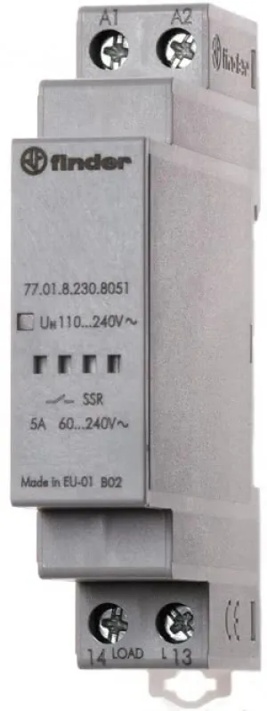 Das Finder 77.01.8.230.8050 Halbleiterrelais aus der bewährten Serie 77 ist die technisch fortschrittliche Lösung zum lautlosen und wartungsfreien Schalten von Lampen, Heizungen und anderen elektrischen Lasten im Haus, Büro oder in der Industrie. Dank modernster SSR-Technologie und Nulldurchgangsschaltung bietet dieses Elektronikrelais herausragende Zuverlässigkeit, Langlebigkeit und hohe Schaltleistungen auf engstem Raum.