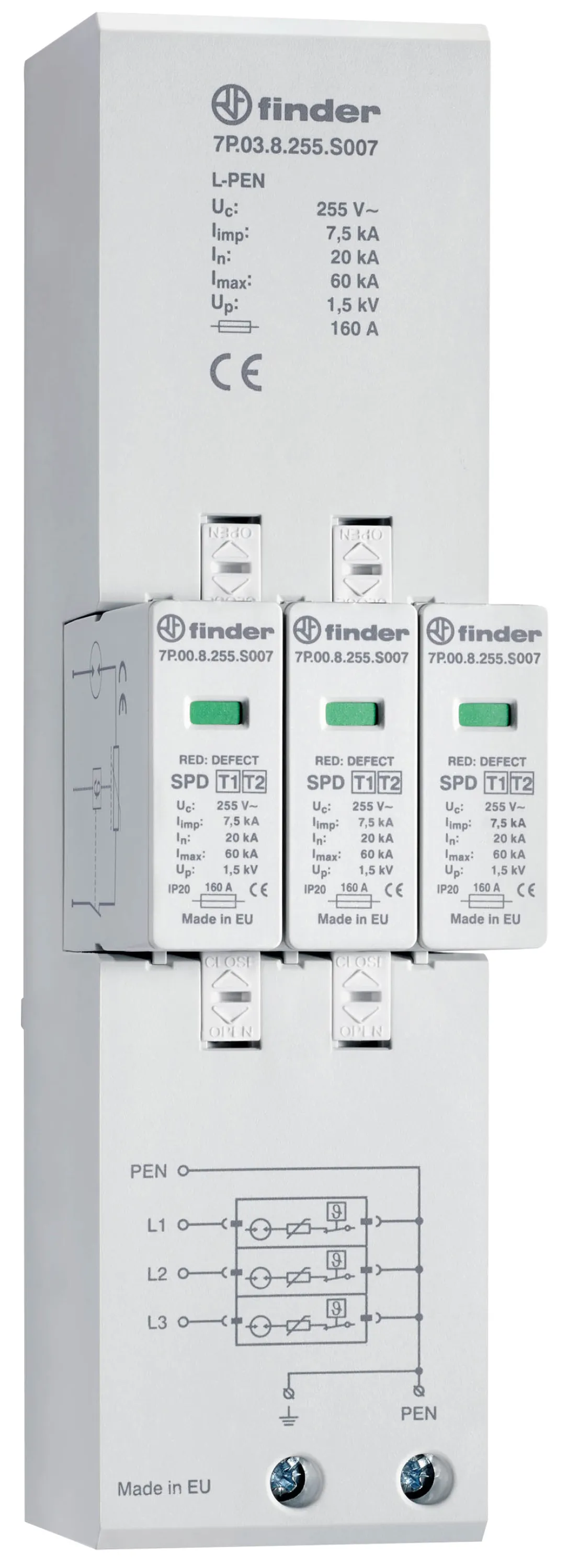 Der FINDER 7P.03.8.255.S007 ist die clevere Lösung für Elektrofachbetriebe, Facility Manager und Unternehmen, die Ihre Anlagen normgerecht gegen Blitzströme und Überspannungen absichern möchten. Im Fehlerfall sorgt die optische Defektanzeige für schnelle Handlungsfähigkeit: Minimieren Sie Wartungszeiten und vermeiden Sie Ausfälle.